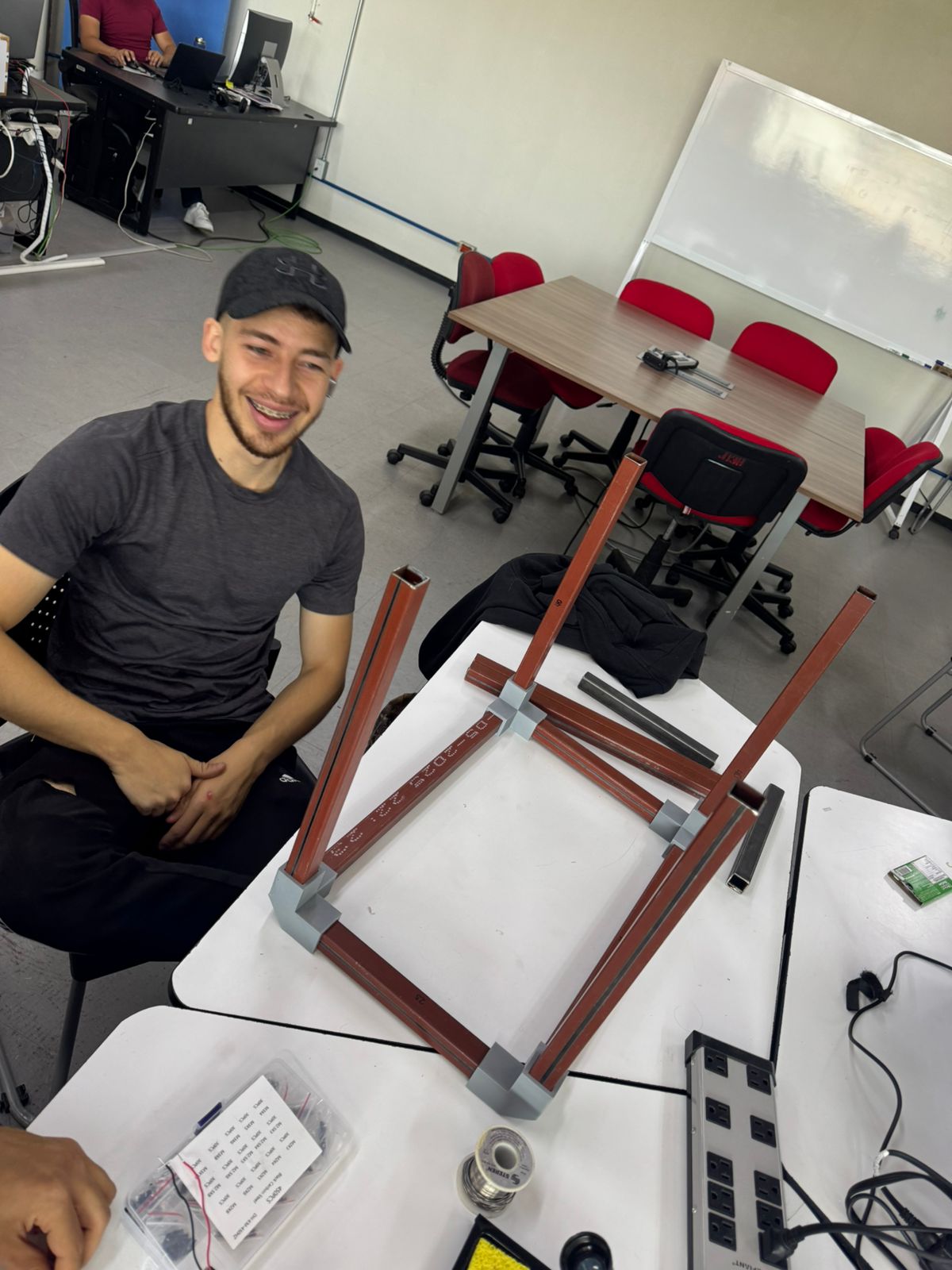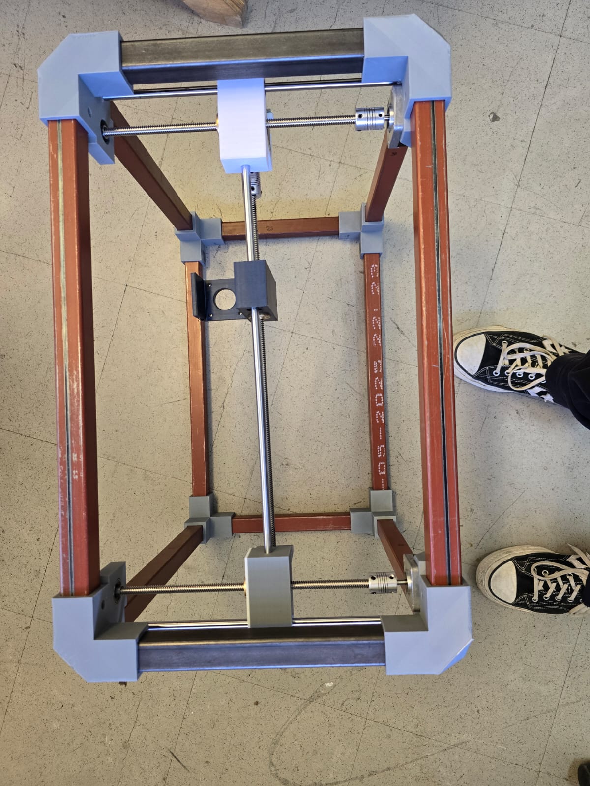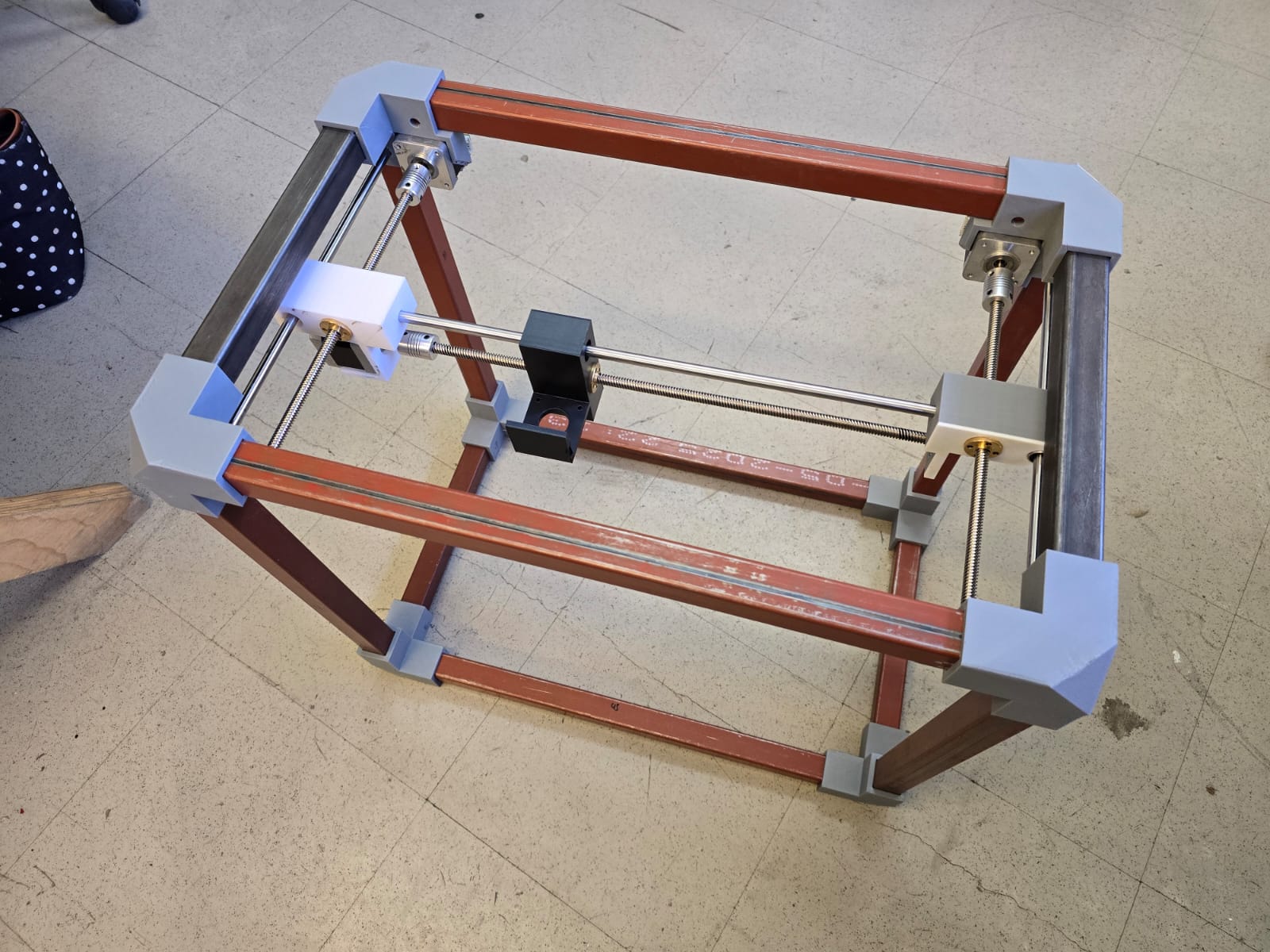 With all materials on the table and measurements noted, we created a 3D model of what we thought the machine would look like. Along with the existing materials, we started designing the missing pieces we would have to print: