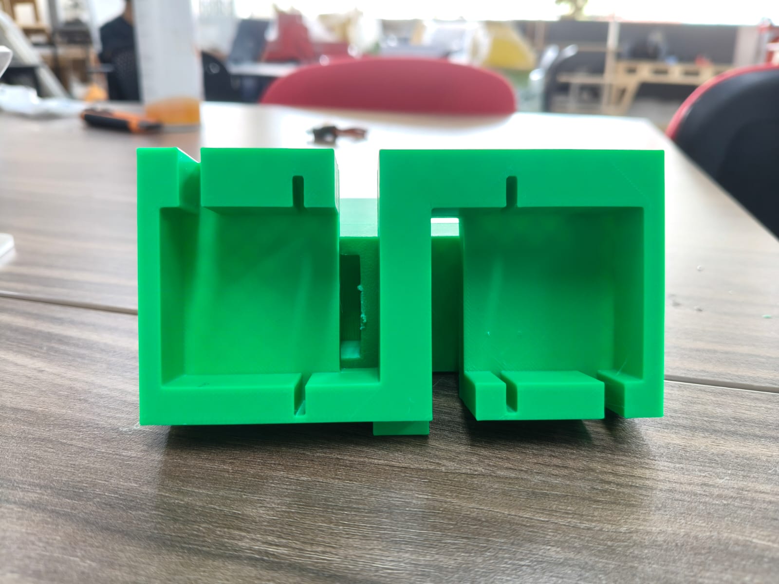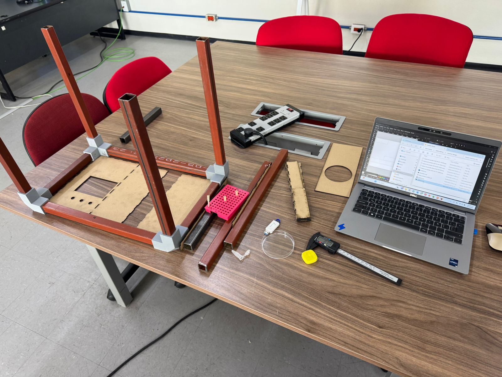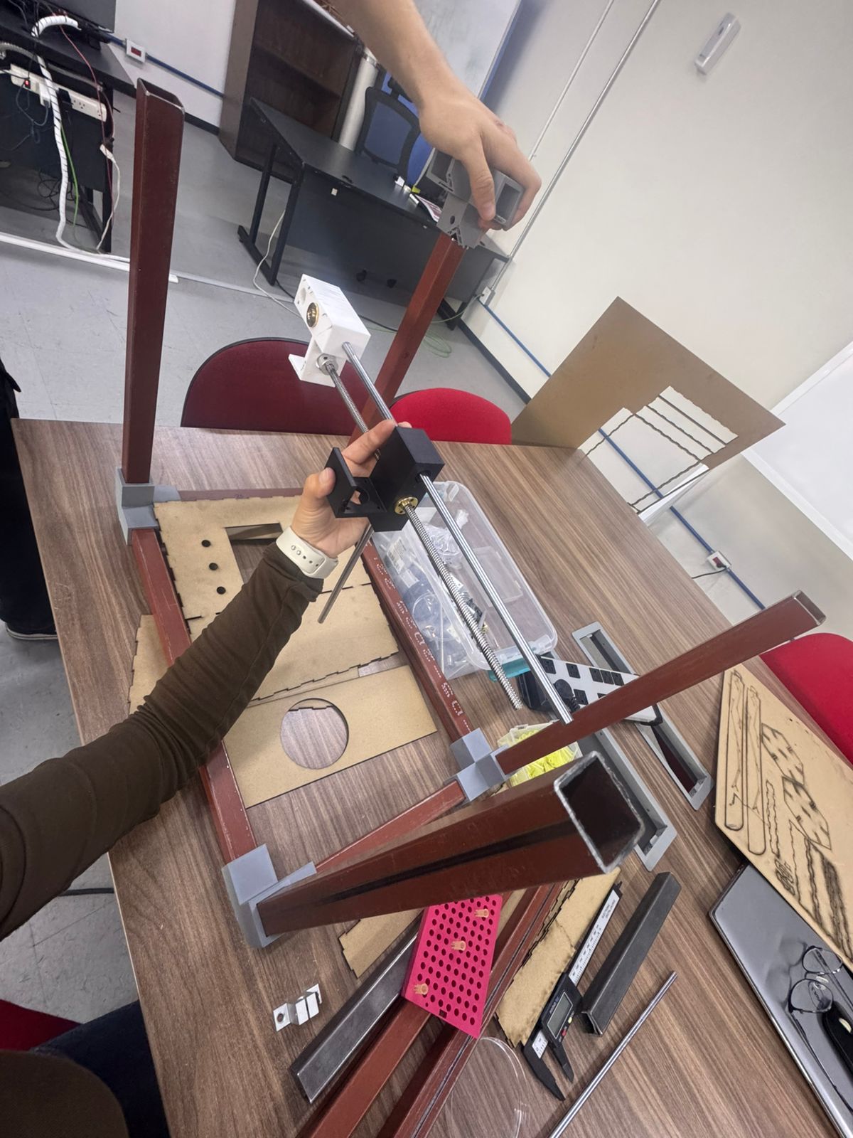 To make sure the wroking area, sizes and holes were correct, we cut out a test on MDF with the laser cutter: