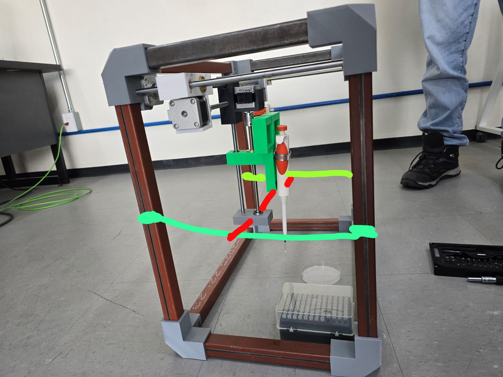 With just manually moving the endless screws of the different axis in our system, we detected a MAJOR flaw: the pipette was swinging to much with every move.