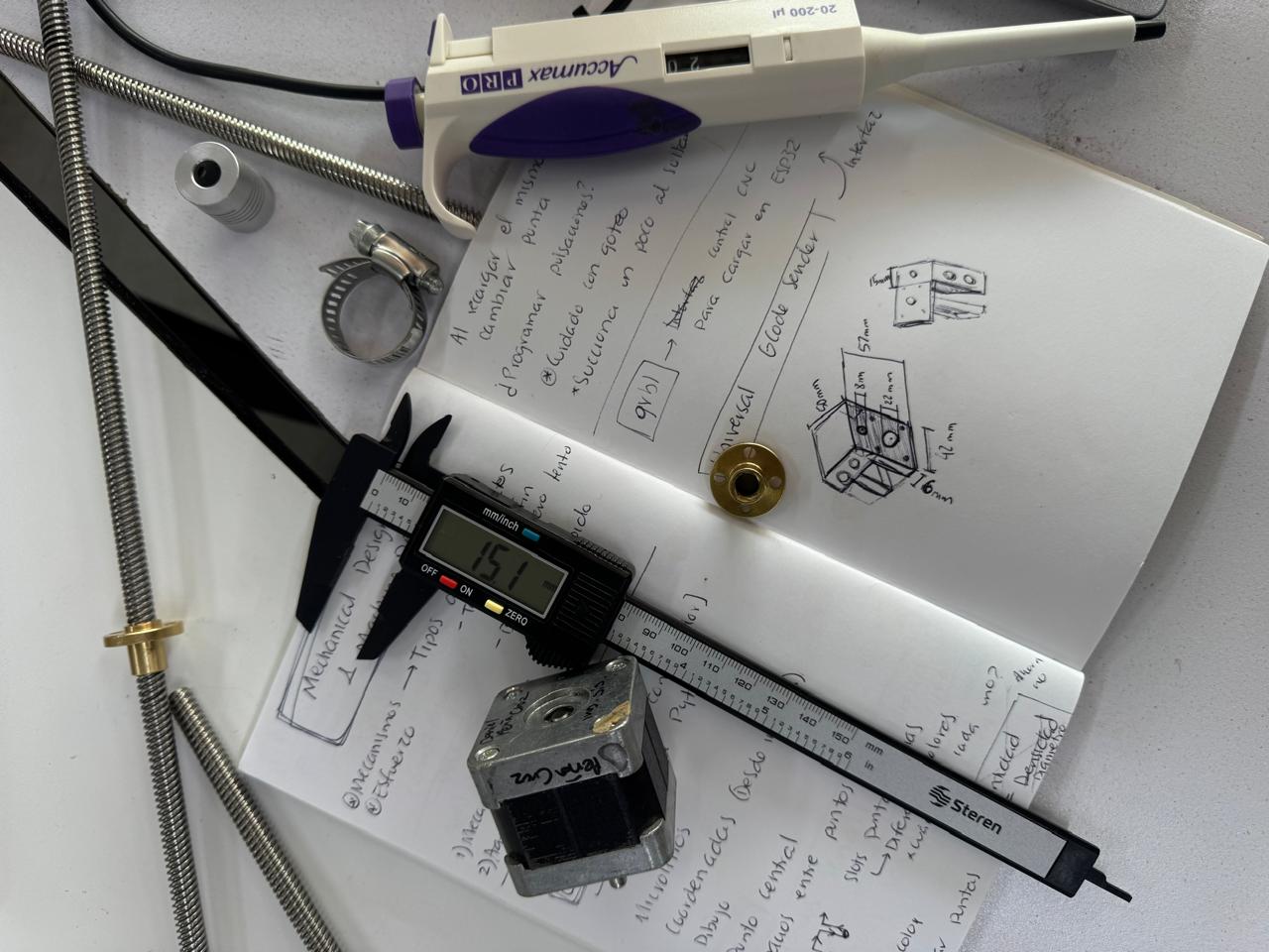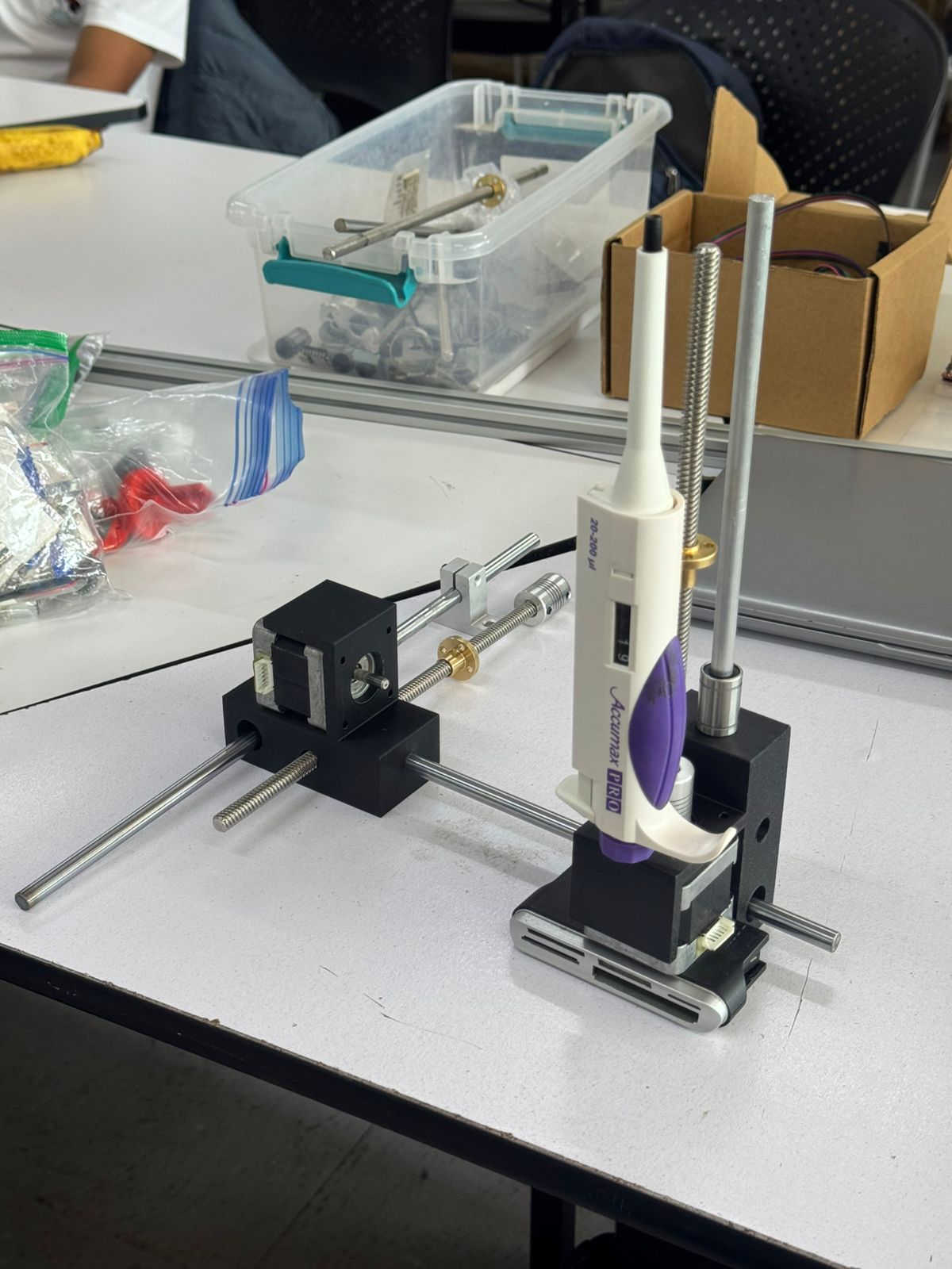 | Z axis | Stop | 3D designed and printed | 1 | Z axis | Couplet | 8mm and 5mm | 1 | Z axis | Pipette | microliters | 1 | Z axis | Clamps | For pipette | 2 |