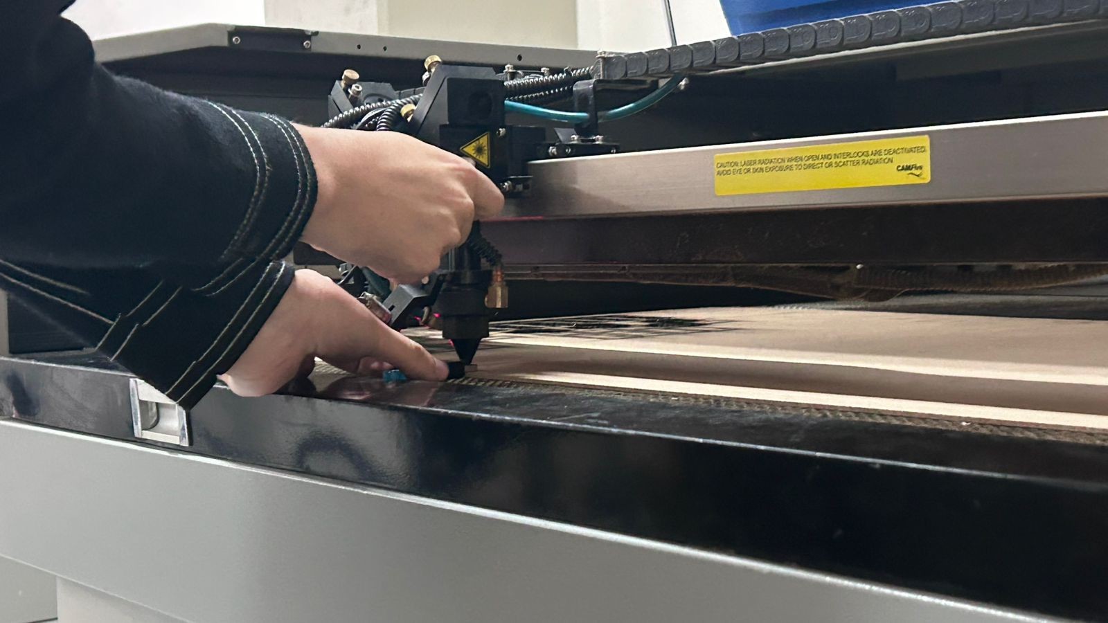 I used the metal spacer tool (calibrated gauge) to adjust the bed height manually. I moved the laser up until there was a space of exactly 5mm between the nozzle tip and the material surface. This 5mm gap is the "sweet spot" where the laser beam is most concentrated and powerful.