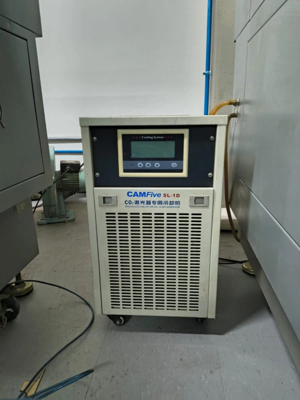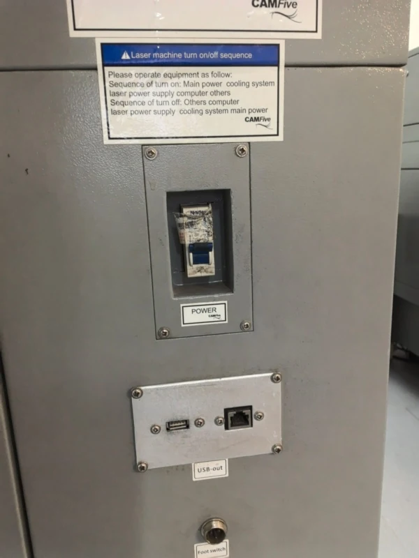 Before sending the cut file, we need to ensure our cutter machine is ready. For it I used the CFL-CMA1080K, so we first check the cooler, then turn on the automatic voltage regulator, then we turn on the machine on the left, then we liberate the safety switch and activate the machine panel with the key. Then we turn on the laserbutton and put it to its max. Normally, the origin is on the top right corner, but we can set up a new origin with the row on the panel control and then pressing the origin button after we have the desired position.