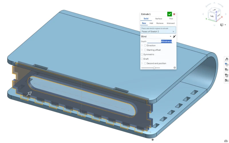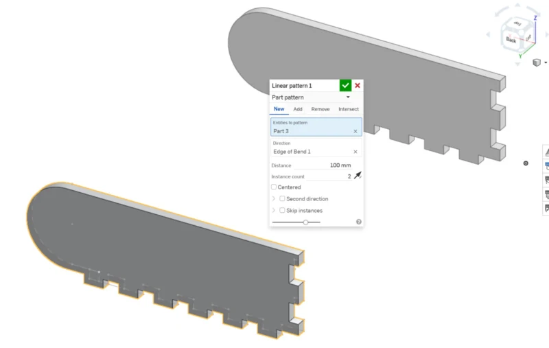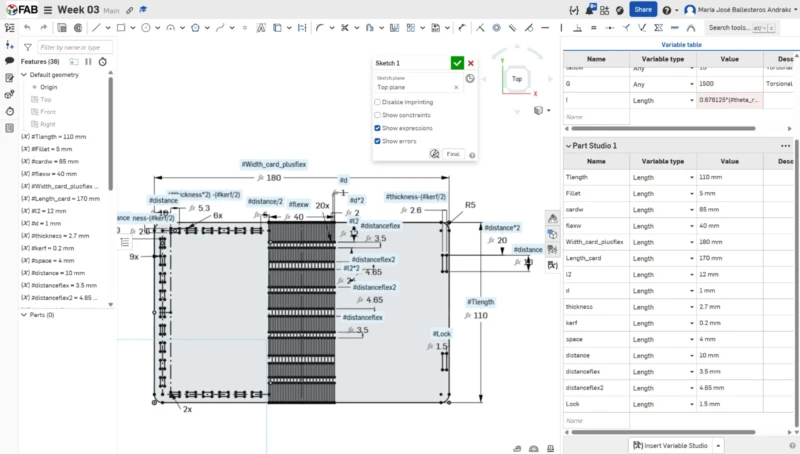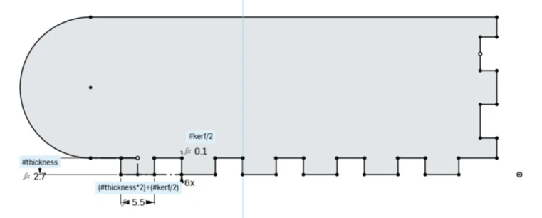 Then I drew the lines for the living/flexible hinge. To be honest, I tried creating a table variable just like our assessors in SolidWorks, but two variables ended up being undefined due to “error regenerating” and I couldn't solve it. So I did it at heart, my first attempt was a failure, because there was too much space and didn't allow a 180 bending. I did a quick laser cut try and my piece snapped. So I searched on the internet, and encountered a youtube video with flexible hinge samples and their radio bending. I saw that a 1mm distance was perfect for what I needed, so I updated my pattern. To do my pattern first, I drew a line that touched the edge, followed by another line that is double the length of the previous one with a small distance. In total, the line section ends with 4 lines. Then I did a linear pattern.