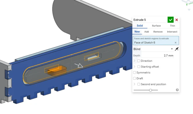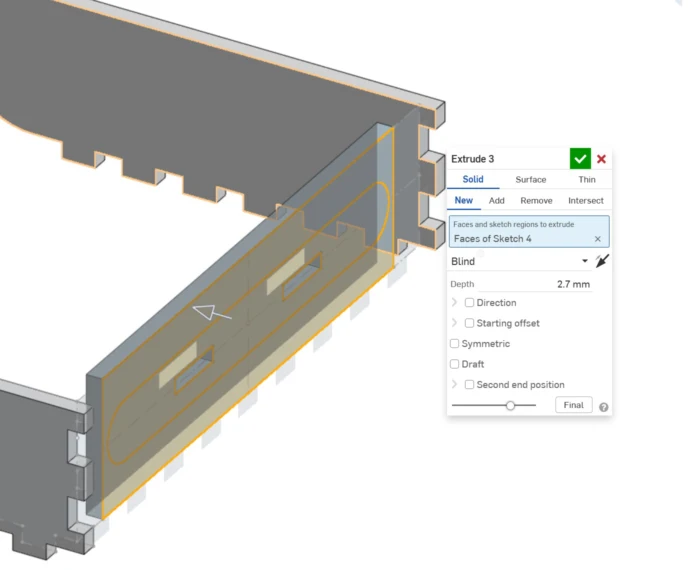 For the following pieces, I followed the same logic, drew the rectangles for the joints based on the previous pieces, and assigned the general size of the piece. Either adding or subtracting some distance and using previous variables. For the side that is repeated I used the 3d tool linear pattern and assigned the length of the piece. This step can be omitted if you do not want the 3 models with all the pieces and just want the individual ones.
