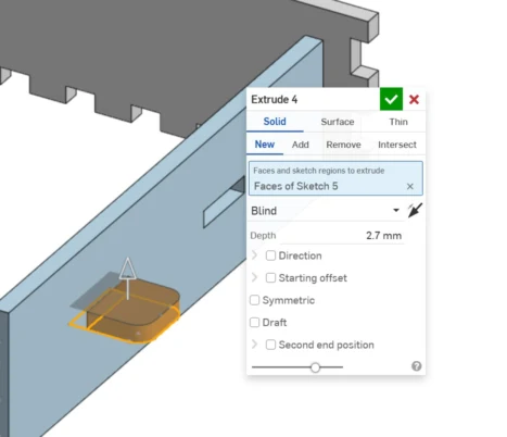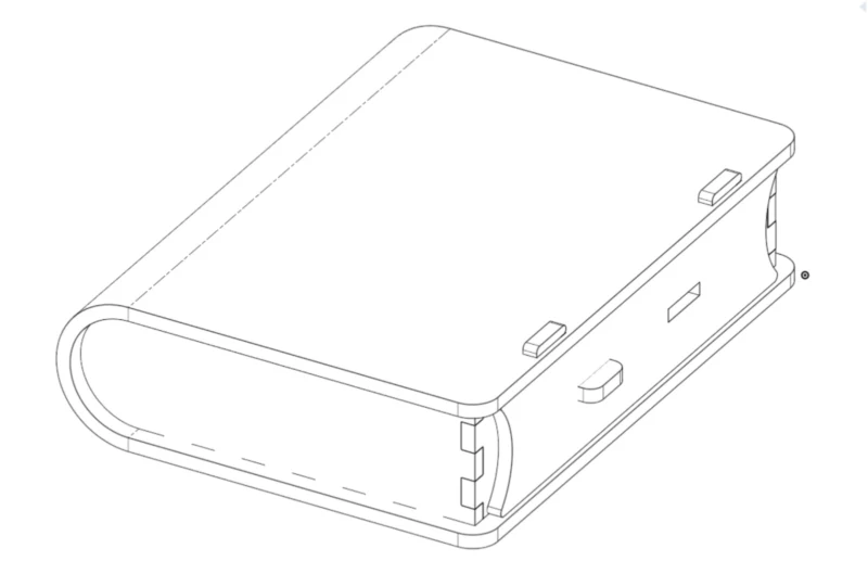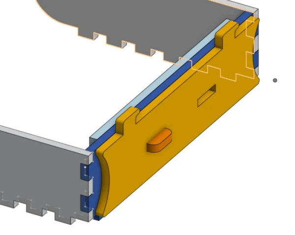 With this, I took the parallel distance between the book's internal faces as a reference to the “front” size of the book. First, I wrote the command (u) to open the “Use” tool and reference the finger holes of the book paste, then I drew a rectangle with the height of the material thickness and the length was (thickness*2)+(#kerf/2). After it, I did a pattern and drew a larger rectangle the size of the piece, then with (m) or “trim” I removed the extra lines. Then I drew a slot that will be the guide to the sliding mechanism. Finally, I extruded the piece.