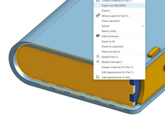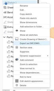 After I finished all my pieces, I exported the first sketch DXF, followed up with the parts DXF. You can either export the sketches or right-click the wanted face of your part and select export DXF. To export, we need DXF format (Drawing Exchange Format- a vectorial file) with the 2000 version (the one our machines work with) in millimeters.