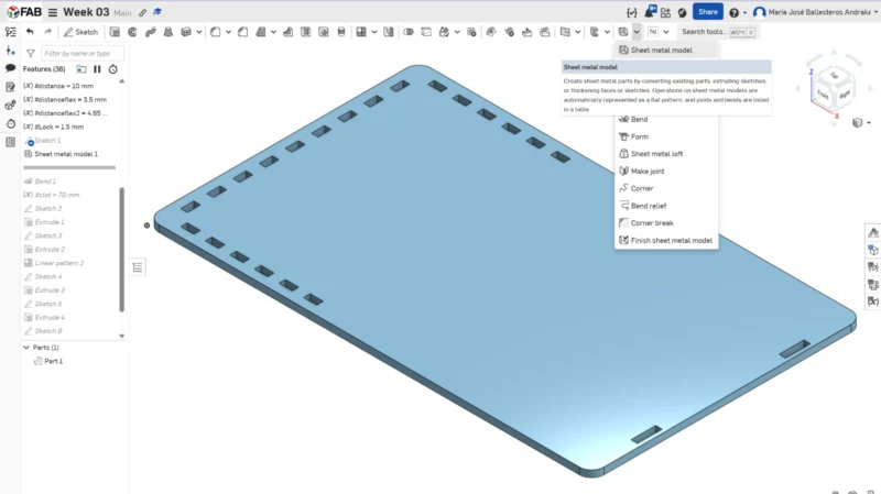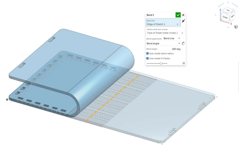Because the sketch is an extended version of the book case it is difficult for me to visualize if what I'm doing is correct, so I tend to model it as its final look, and use the principal planes to model (top, right, and front), and model using the previous piece form. In this case, because my sketch bends, instead of using the normal extrude tool, I used the “Sheet metal model” that allows me several operations from a “sheet or plane” even though my design is not metal-made. Some operations we can do are: Flange, Hem, Tab, etc. In this case, I used “bend” and used the center line of my flex hinge pattern as the bend line.
