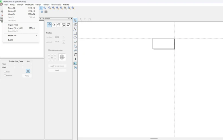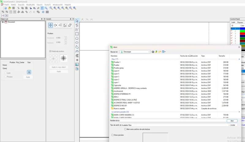To laser cut, we need to import our files to Smart Cave software. To use the program, we need to insert a USB security dongle, which works as a key to open the program. If we do not insert it, we can't use the program. Once opened, the workplace interface, we select the menu option and click on the import file. Then we select our file. If we have several files, we must repeat this process one by one.The program will ask you in what work units you want to import it, select millimeters