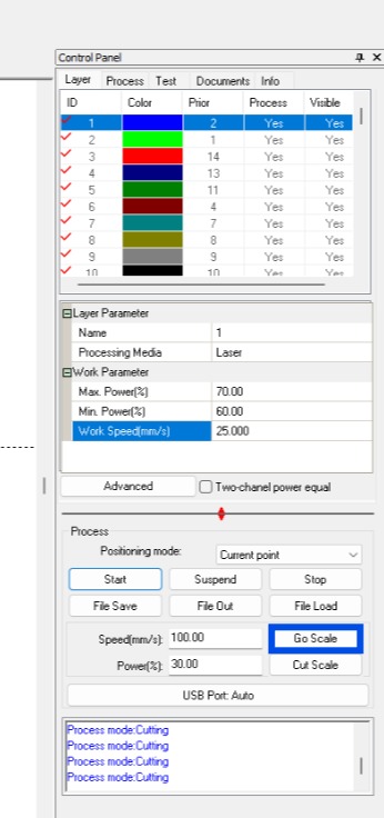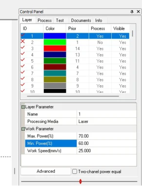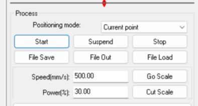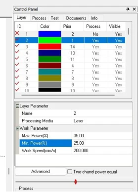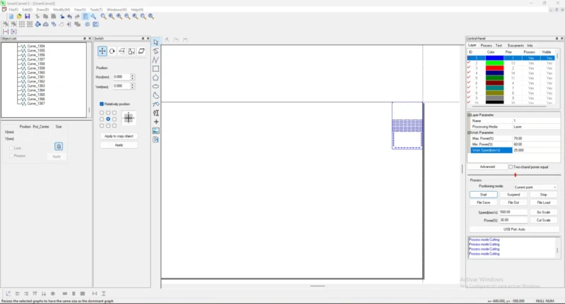 Once I have the accommodation like I wanted it, I selected the pattern group and changed it to a different ID process in the control panel, with that I can adjust the parameters (Max %, Min%, and work speed) depending if it's a cut or engraving process.