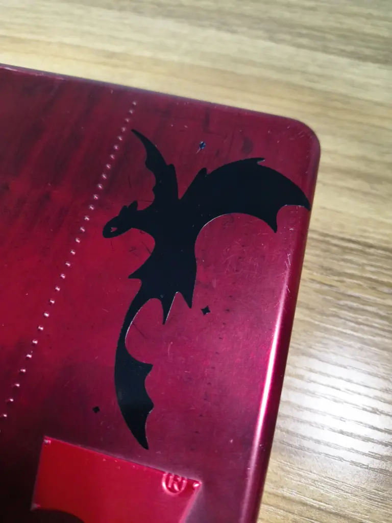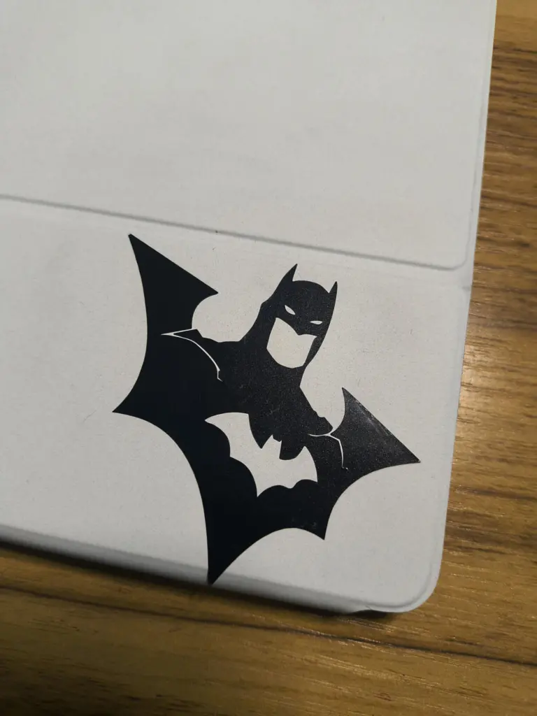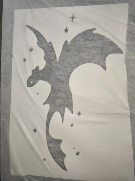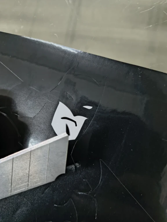 The design is now ready to be applied. Choose a clean surface, remove dust or grease, place the design, press with a card, remove the transfer paper, and the vinyl application is complete.