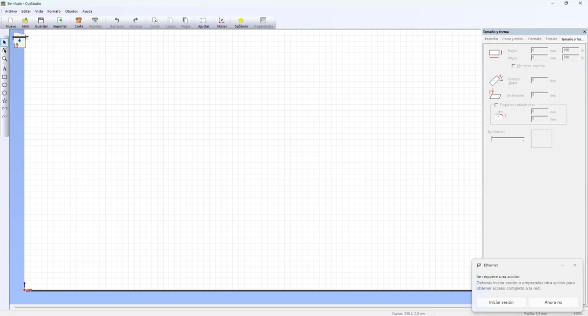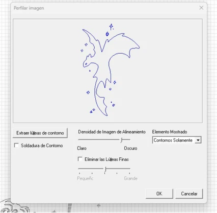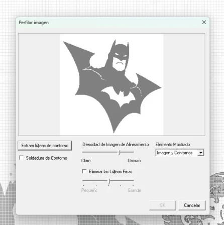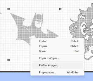 For JPEG files, select the image, right click and choose “perfilar imagen” (outline image). This opens a window where you can choose the final result (image + outline or just the outline). After that, the image size can be adjusted using the size and form window. For this exercise, I used the total material area and repeated my designs in a smaller scale.