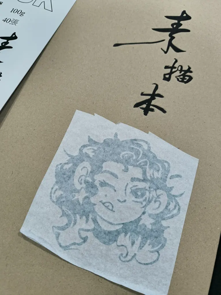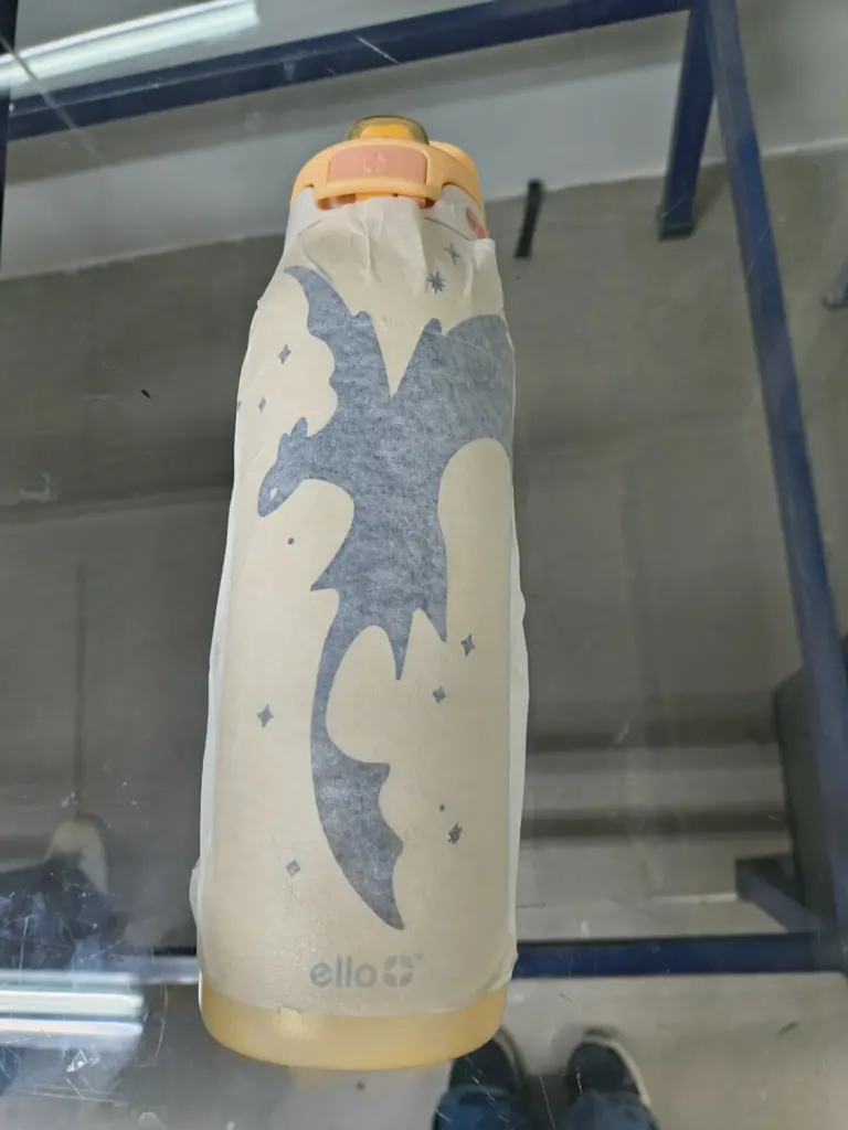 Once cleaned, transfer paper is applied. It works similarly to masking tape. I had some issues because it was extremely sticky and tore easily, which caused wrinkles. With help from a classmate, I focused on pressing the design with a card while the transfer paper was rolled evenly.
