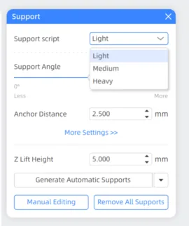 10. Then add supports. The first print I sent was with medium supports, but I believe for these model its better the light supports as they are easier to remove.