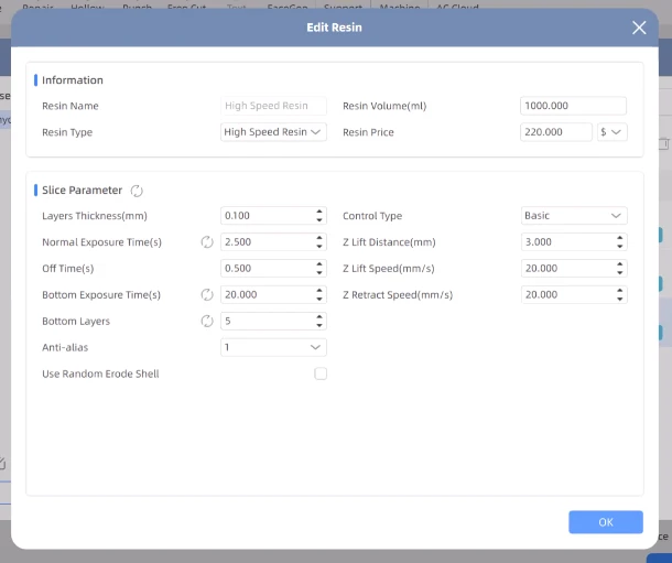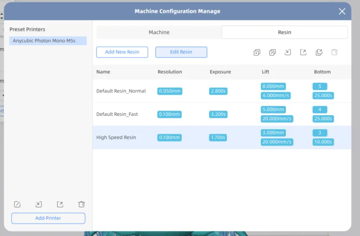 11. Before slicing, select the type of resin you are going to use. In this case I selected High Speed Resin.