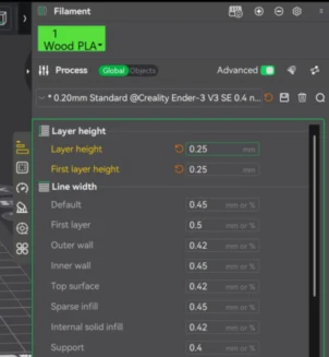 2. Then I change the preset PlA parameters to a layer height of 0.25mm because I used Wood PlA and having a low layer height can clog the nozzle.