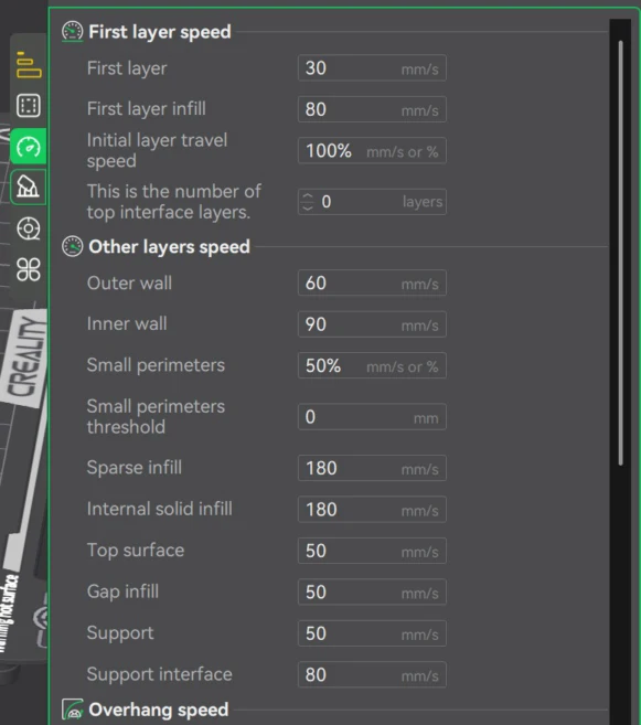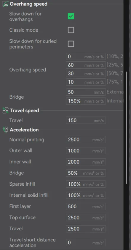9. I enabled “slow down for overhangs” to improve print quality in the fins and hinge areas. Slower speeds allow better cooling and reduce sagging in unsupported sections.