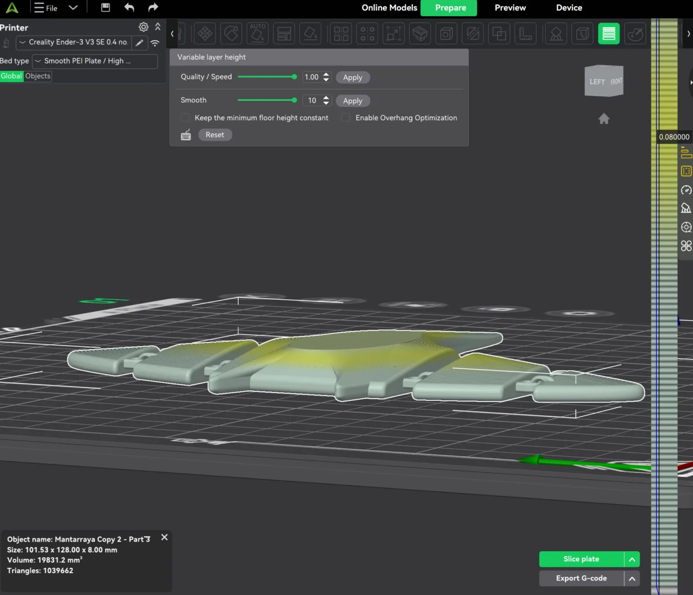 13. Once you like the layer heigh results, click on the arrow next to send print and select slice plate.
