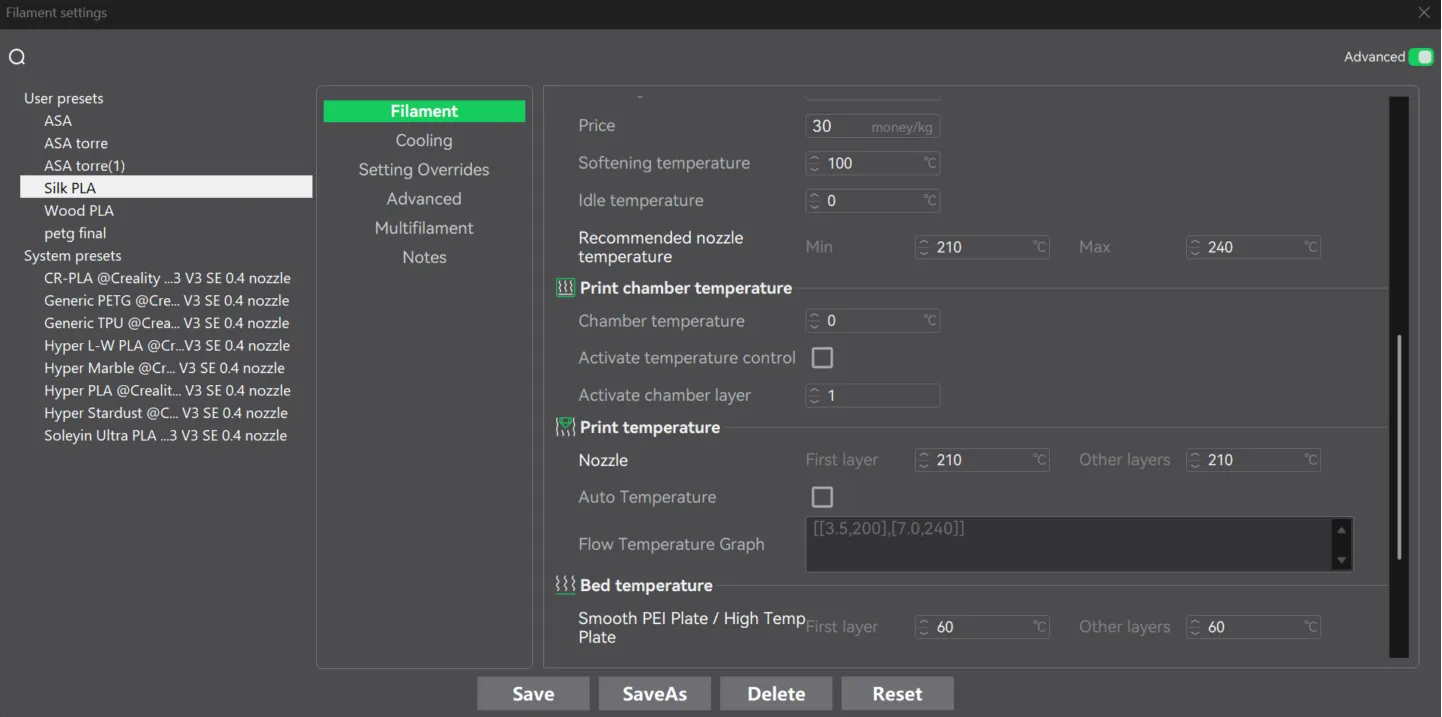 It has almost the same parameters as the system preset PLA but I changed the nozzle temperature to 210º C and bed temperature to 60º C
