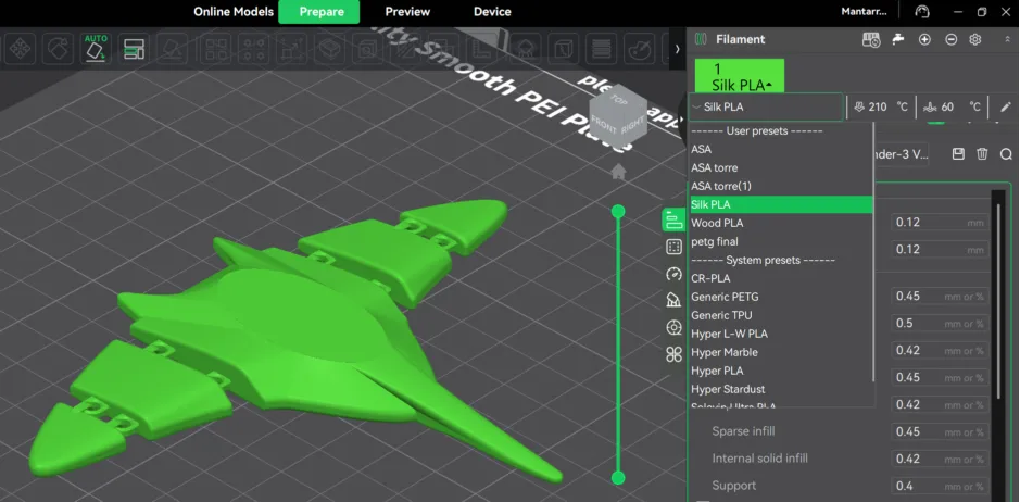 4. On the right side, you will find the print settings panel. For this exercise I chose a user preset I made for Silk PLA.