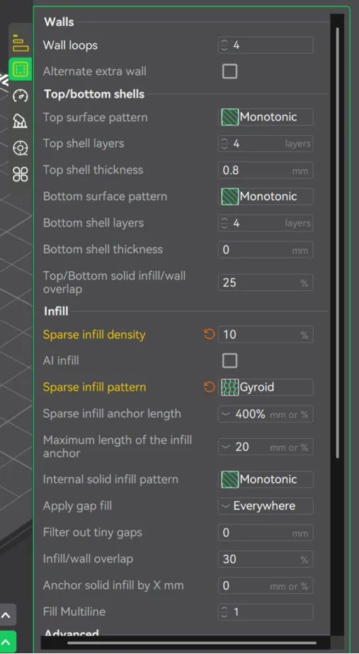 7. For the infill I reduced the density to 10% with gyroid pattern. I selected these parameters because the piece is not structural and relies mainly on wall thickness for strength. This reduced material usage and print time while maintaining sufficient internal support.