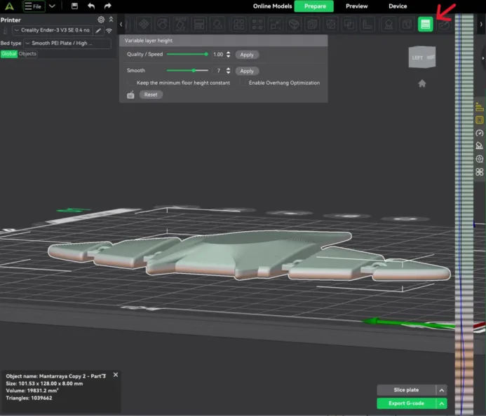 11. Because my piece is curved and I wanted to improve its quality. I used the Variable Layer Height this allows us to automatically or manually adjust layer thickness throughout different regions of the model instead of using one constant layer height for the entire print.