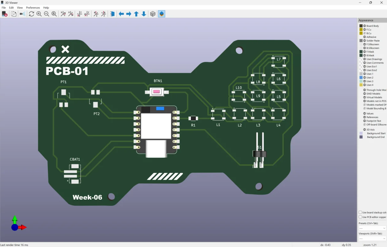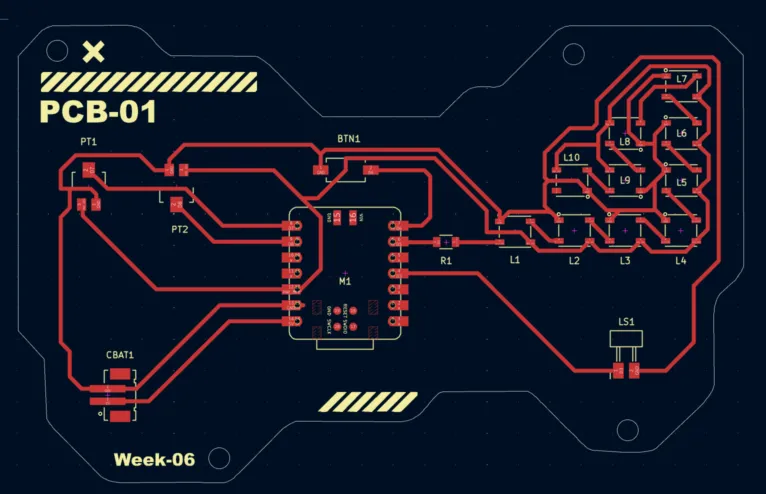 This week I learned more about electronics components and circuit design by exploring schematics outside of Wokwi. Working with the circuit diagrams and planning PCB layouts helped me understand how each component connects, why resistors are used, and how Ohm’s Law applies to control current safely.