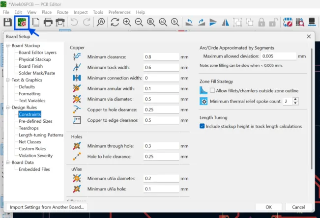 5. To wire them you need to have follow Desing Rules. To edit them Go to board Setup and change the parameters. These were the ones I used.