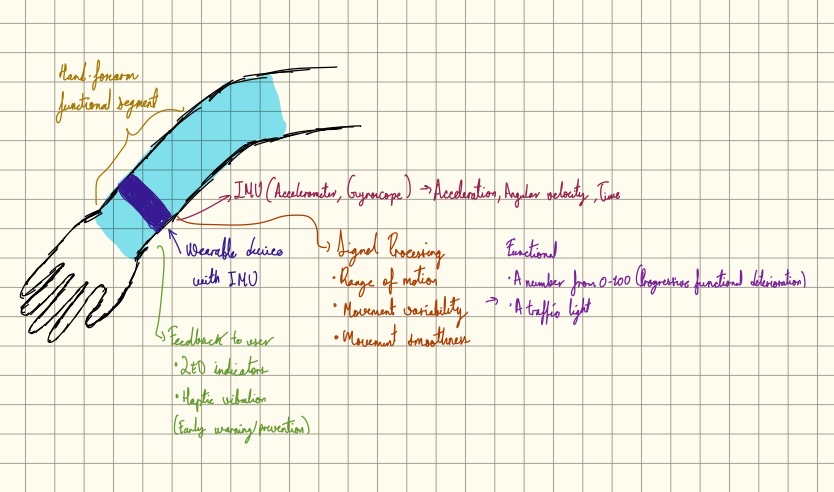 The device is meant to provide visual and haptic feedback to indicate early changes in the functional performance. The goal of the system is not to diagnose disease, but to detect early functional deterioration and support preventive monitoring in everyday conditions.