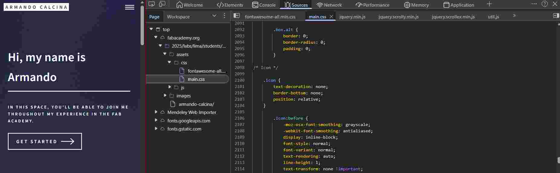 For my own website I stated by reusing the nabvar and main index design just without the animation and measures the original page have. I made sections about how I wanted some of the containers and codes to be shown, also I made all colors independant of each week and section, a permanent bar same color as the home on top showing my name in every page, and the side bar to go through other sections rather that the weekly assigments.