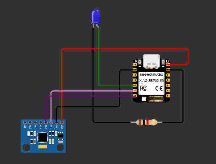 For this section I used the simulation program Wowki and I used a C++ and a python code, my simulation consists on a led that lights on when it detects a movement range I made a range from 1-100, using the Xiao and a MPU.