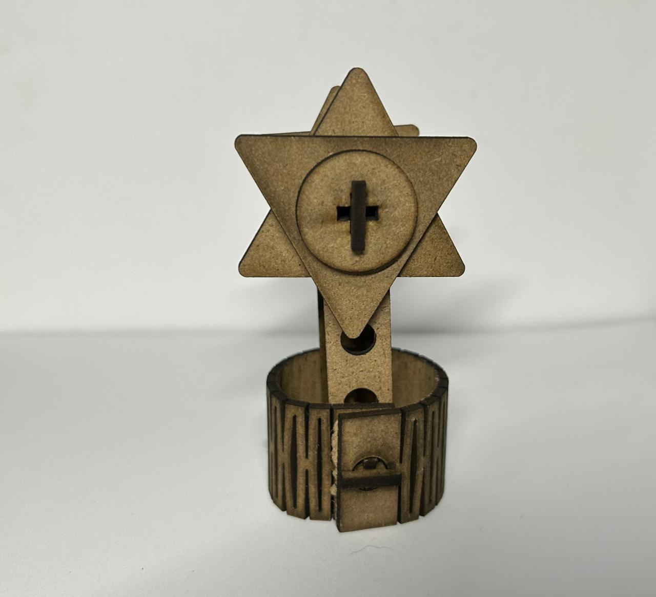 This cross union piece is designed to connect multiple modules. It is parametrically defined with variables for thickness, kerf, and the size.