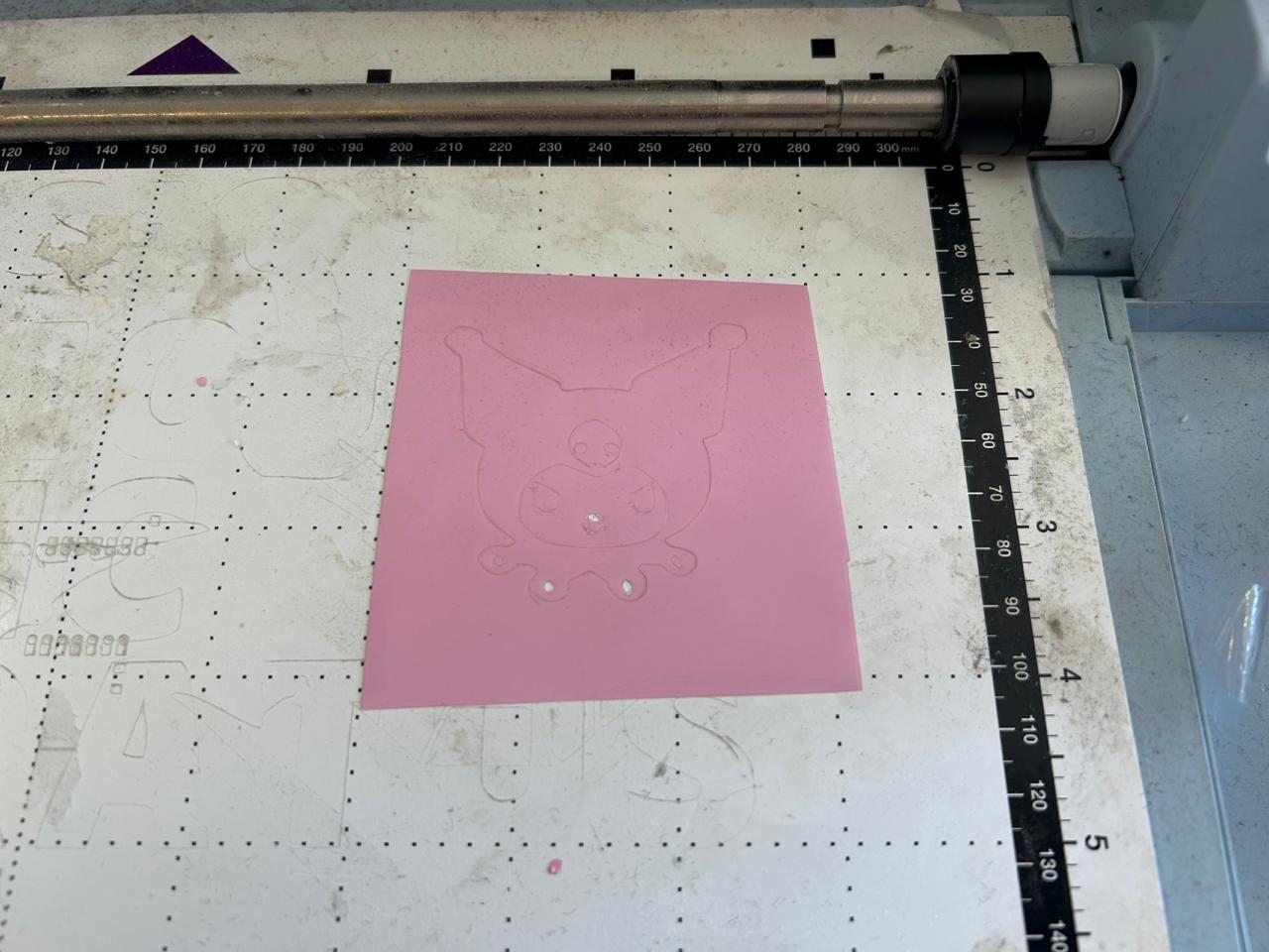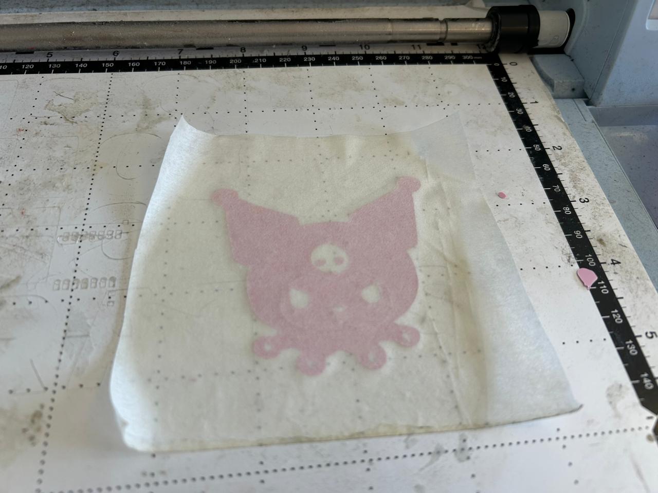 For my vinyl cutting project, I decided to use textile vinyl material. After cutting the design, I used a heat press machine to transfer the vinyl onto my lab coat. The result was a cute Kuromi design on the sleeve, which I really liked.