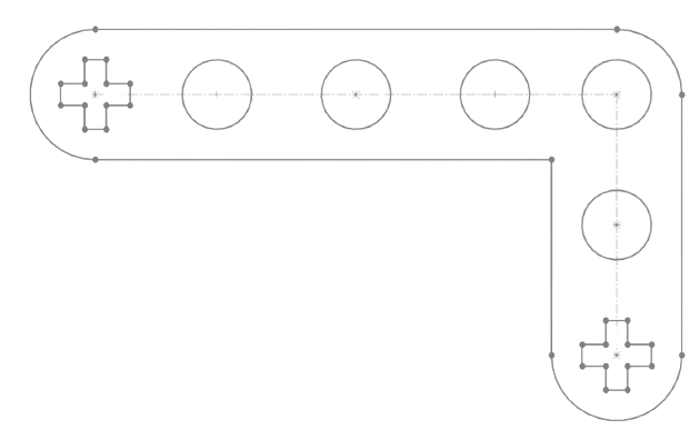 This piece serves as the structural link of the modular kit. It features regularly spaced slots that act as universal attachment points, allowing other modules to be easily connected. This part is a simple line that can be parametrically modified in length and thickness. Also the circles and the cross sections of the line are parametrically defined, allowing for easy modification of the entire design.