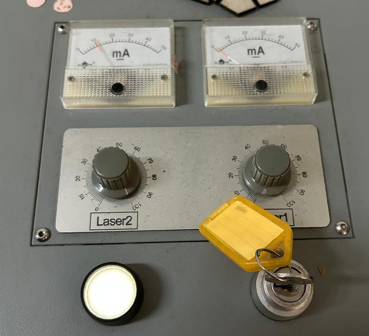 Once the laser system is powered on, on the top part of the control panel, you can adjust the laser power with the control knobs.