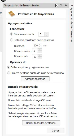 To ensure the pieces don't fly off when they are completely cut, we have to add Tabs. In this menu, you can edit the number of tabs you want to add depending on the size of the piece. You can also move them to different positions to avoid placing them in areas where they would be difficult to remove later. Once finished, you close the menu. The recommended size for these tabs is 5 mm * 4 mm.