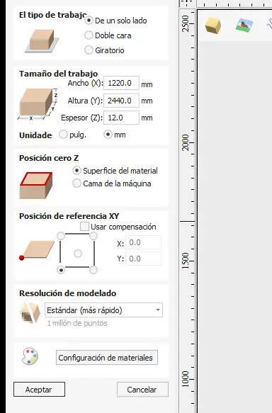 The first thing that appears is the Material Setup configuration. You must define the document size, then set the Z zero, which in this case is on the material surface, and finally set the XY reference point, located at the bottom-left corner.