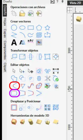 In this menu on the left, you will find many options: you can create vectors, edit objects, move and position them, and much more. The most important elements used for this project are circled in red and purple.