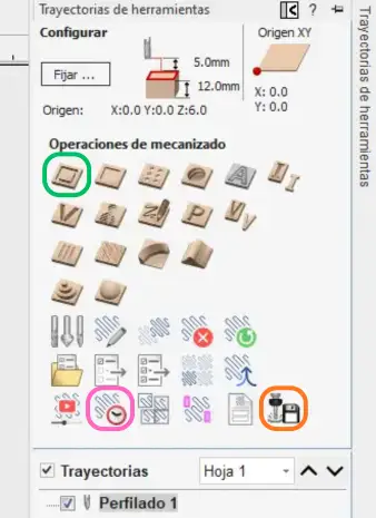 To finish, click Calculate to generate the toolpaths. In my case, I generated two paths: the internal cuts and the external profile. In the orange option, we export our document, where we can select the specific machine we are using and save the file to a USB drive for the CNC. Finally, in the pink option allows us to see an estimated time of how long the job will take.
