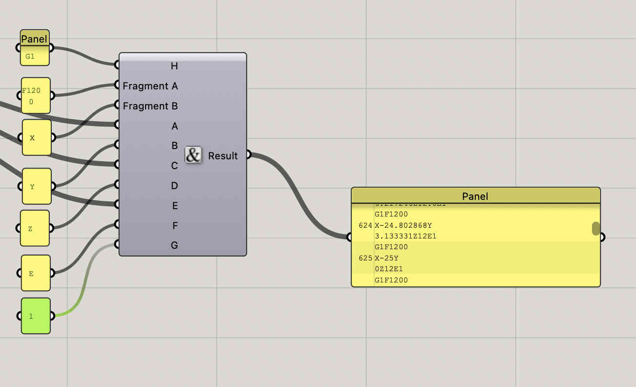 Each panel on the left indicates a a postion or a code, the result panel takes values from co ordinates and merges both to create a aphanumeric file.