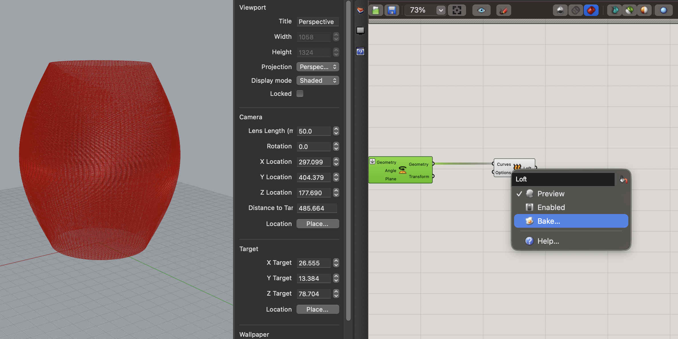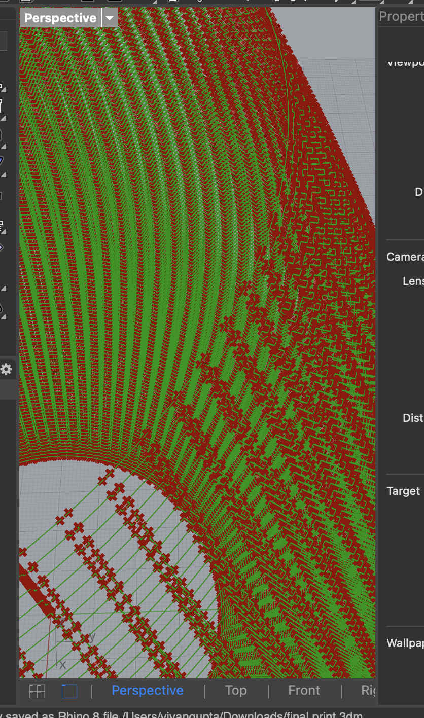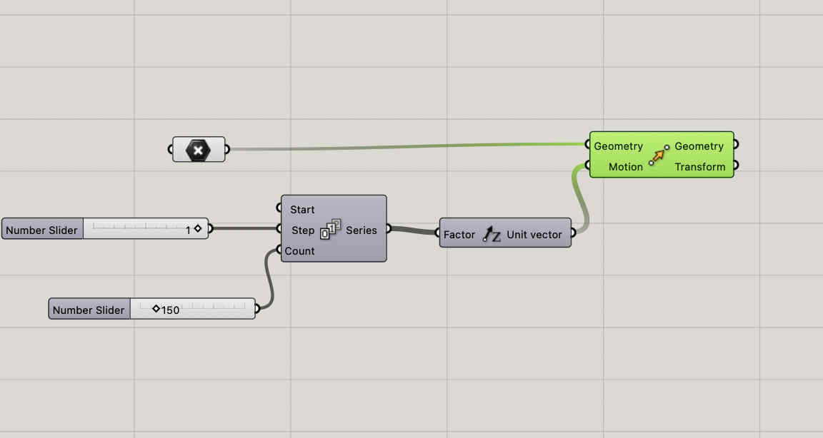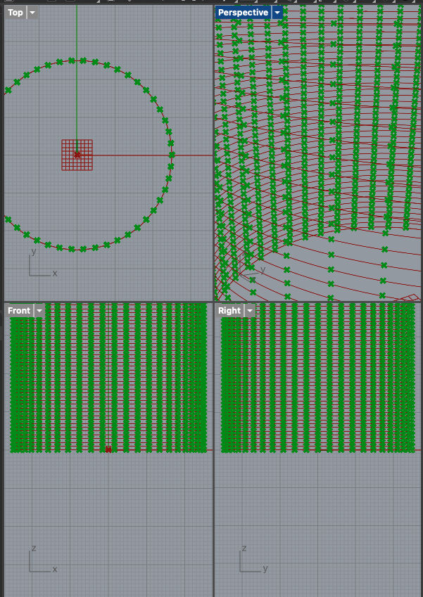First we open rhino and set our document properties to mmWe plot point's at the center, of the grid, 150 point array. the grasshopper looks something like thisResultNow we need to create circles with our points as centresOnce we do that such lines should appearAlong those dots, we need to create more dots at a certain distance so that we can create ridge like structuresWith these new dots we can offset lines which we can join later to create gear like structures in an progressive mannerHere we create a offset of the segments created by the dots as seen in the previous oic Now we need to bridge the two segmentsWe cross connect start and end segments that we take into a curve module by nesting all togetherResult, you can see how the lines no connect with each otherNow we take all geometry into one module, such that we can loft the structuresAlmost thereBake your loft into blenderBaking might take time but VOILARemeber to lock all your grasshopper commands that are computationzlly heavy, they will cause issues on restart, also hide themResult