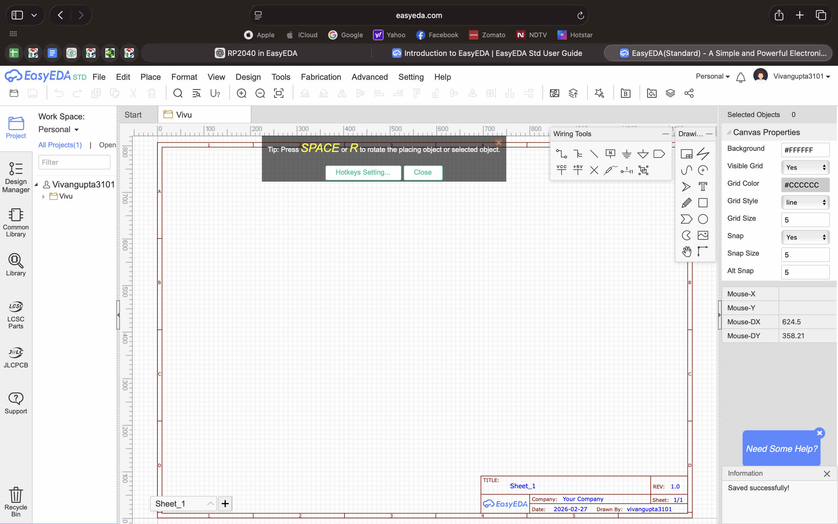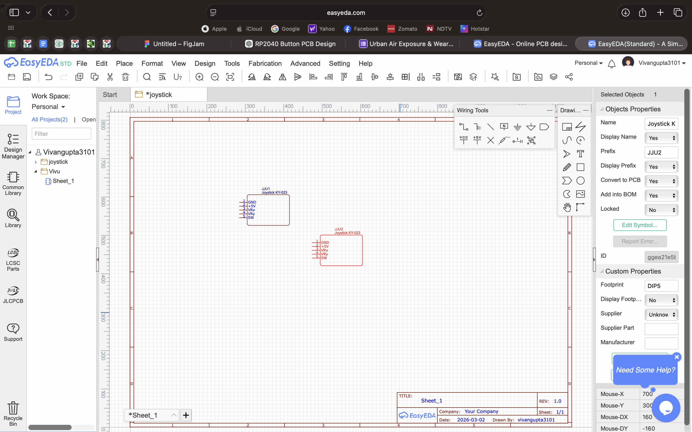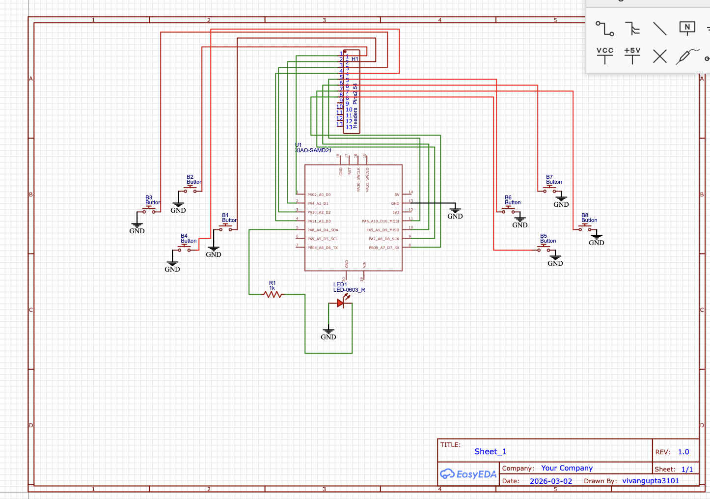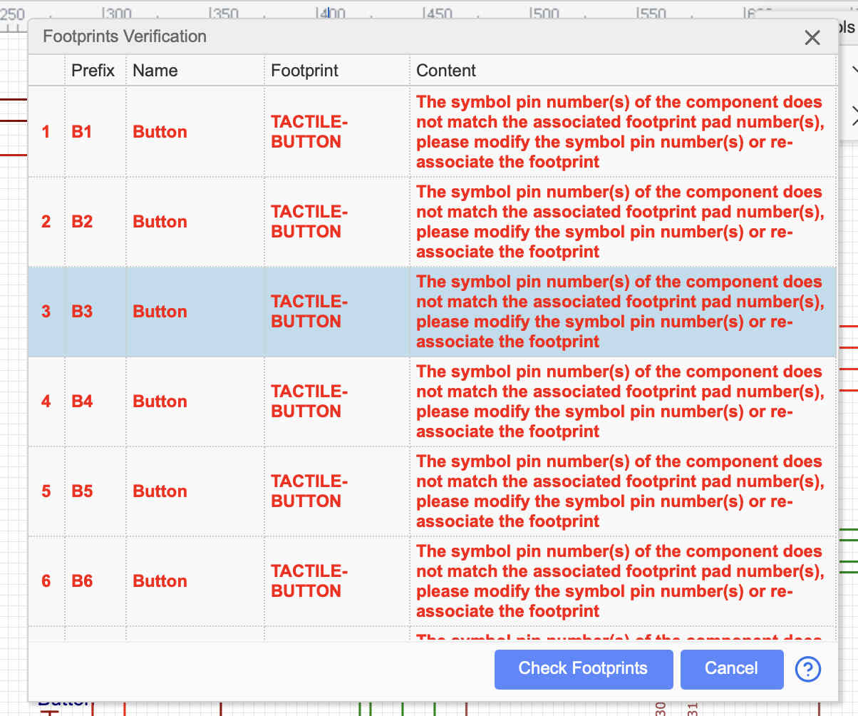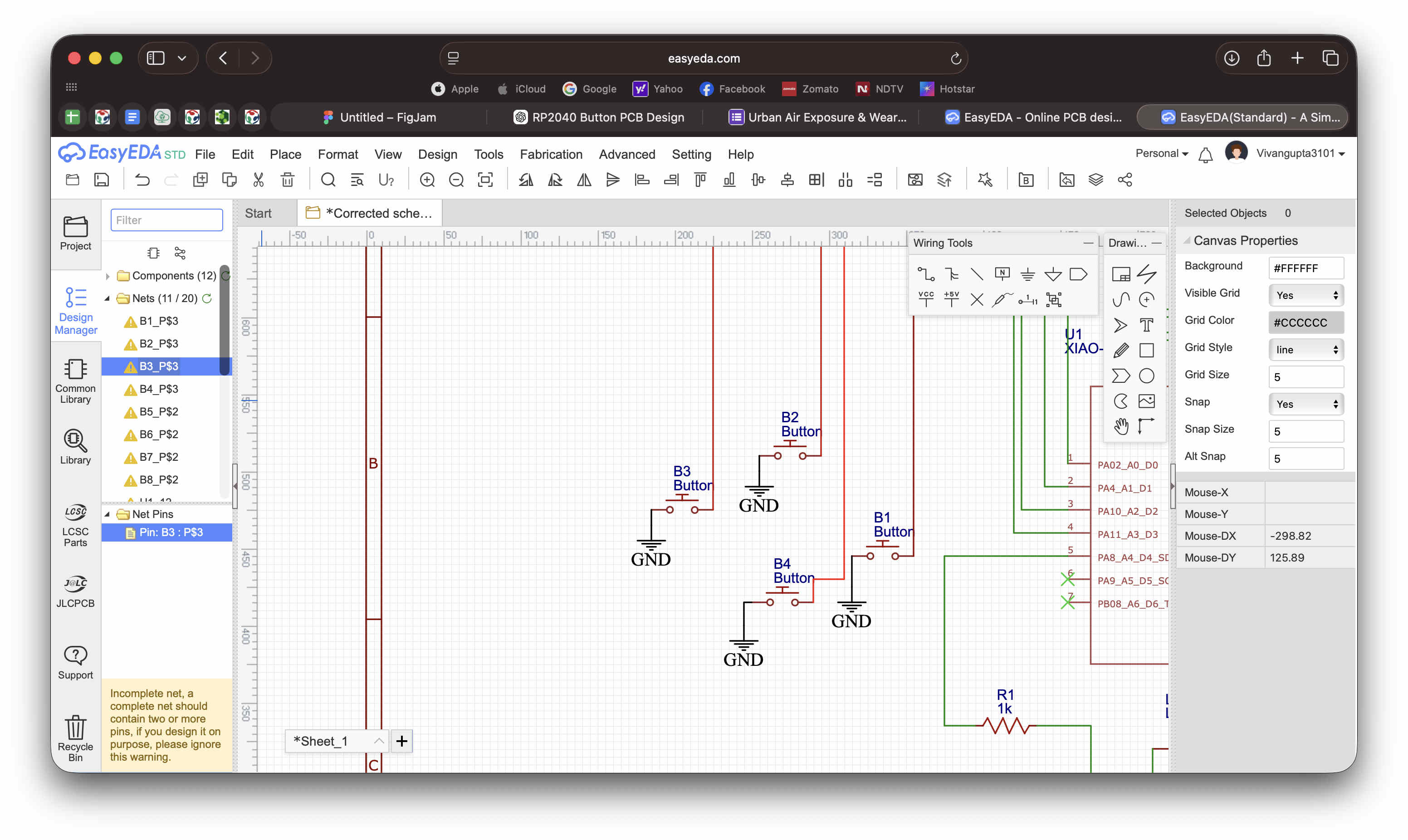 With the hassle involved with pro I decided to shift to EDA std onlineRewiringAgain on DRC, i got some errorsI quickly realised that i had not closed the un-used net portsIn easy EDA, if you have points of a pcb or header or any part that is unused, make sure to cross these endings to avoid errors.I ran into another issue with my buttonsMy footprint for the button and the schematic naming was completly haywire and basically it was not the correct part
