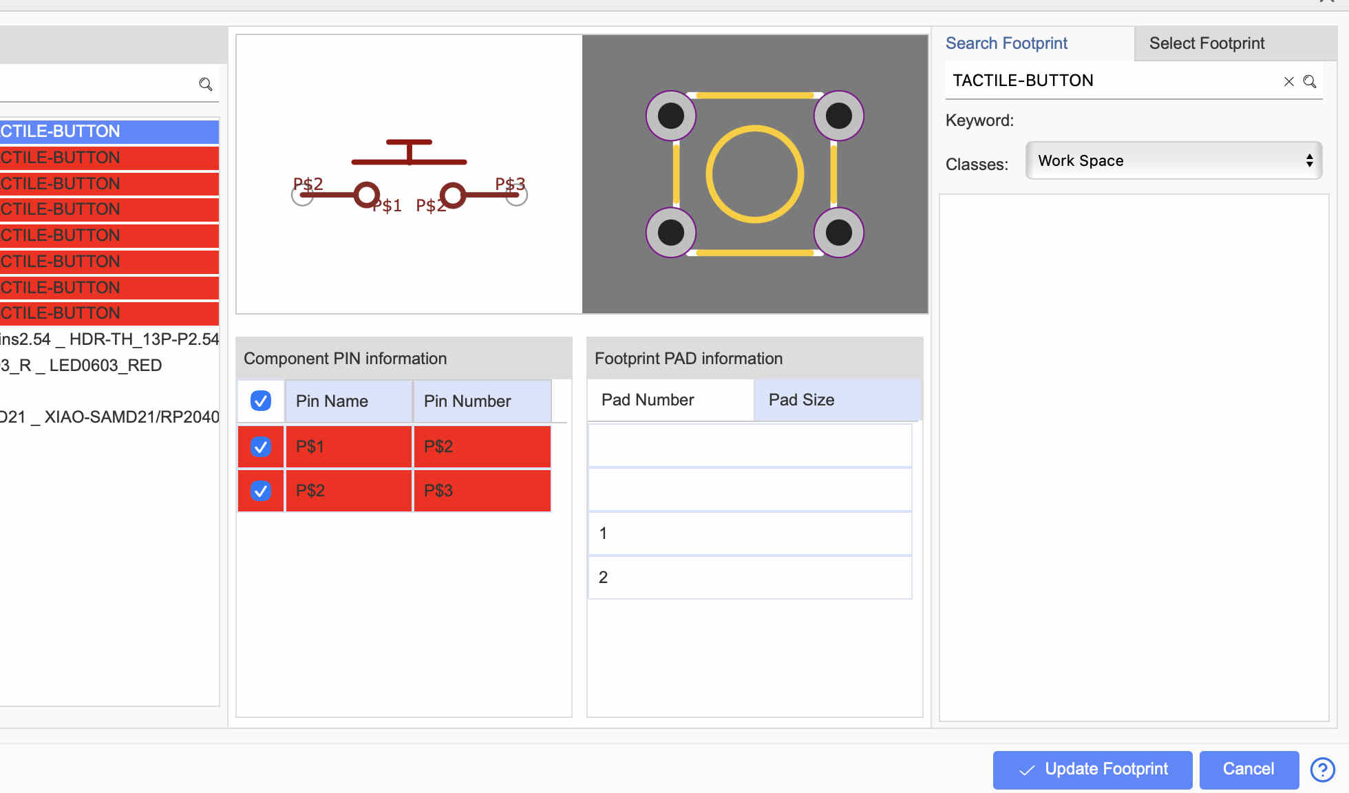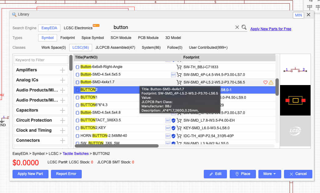 This time I chose a button from the LCSC assembleable libraryThis time I chose a button from the LCSC assembleable libraryAfter wiring again I ran DRC and converted the schematic to a PCB.