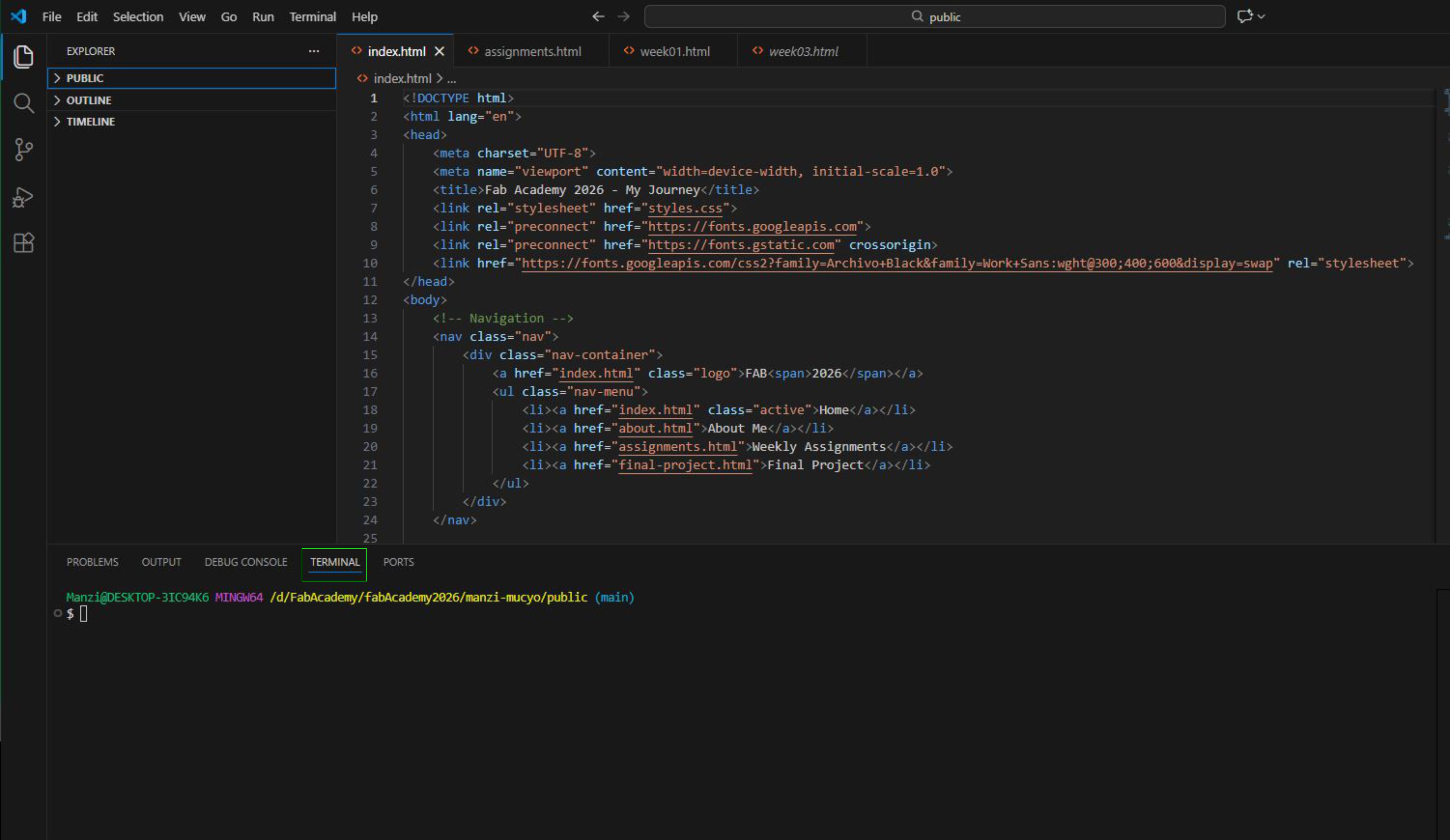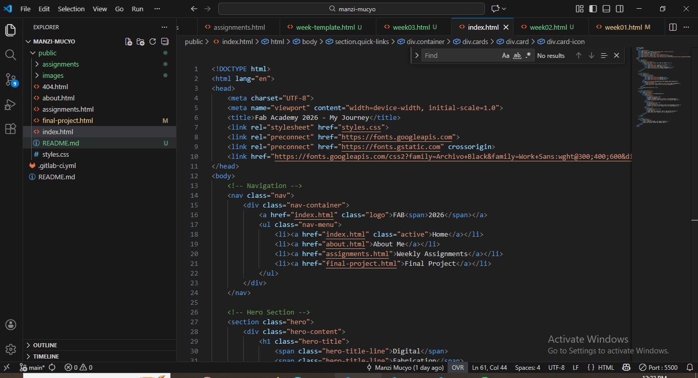 This week focused on introducing the structure of the course and preparing the foundation for future assignments. I defined a potential final project idea and learned how to properly document my work. I explored GitLab and version control concepts, created and configured my personal GitLab repository, and practiced basic Git commands. I also customized the default GitLab webpage by adding personal information and an initial description of my final project, ensuring that my documentation is clear and well organized.