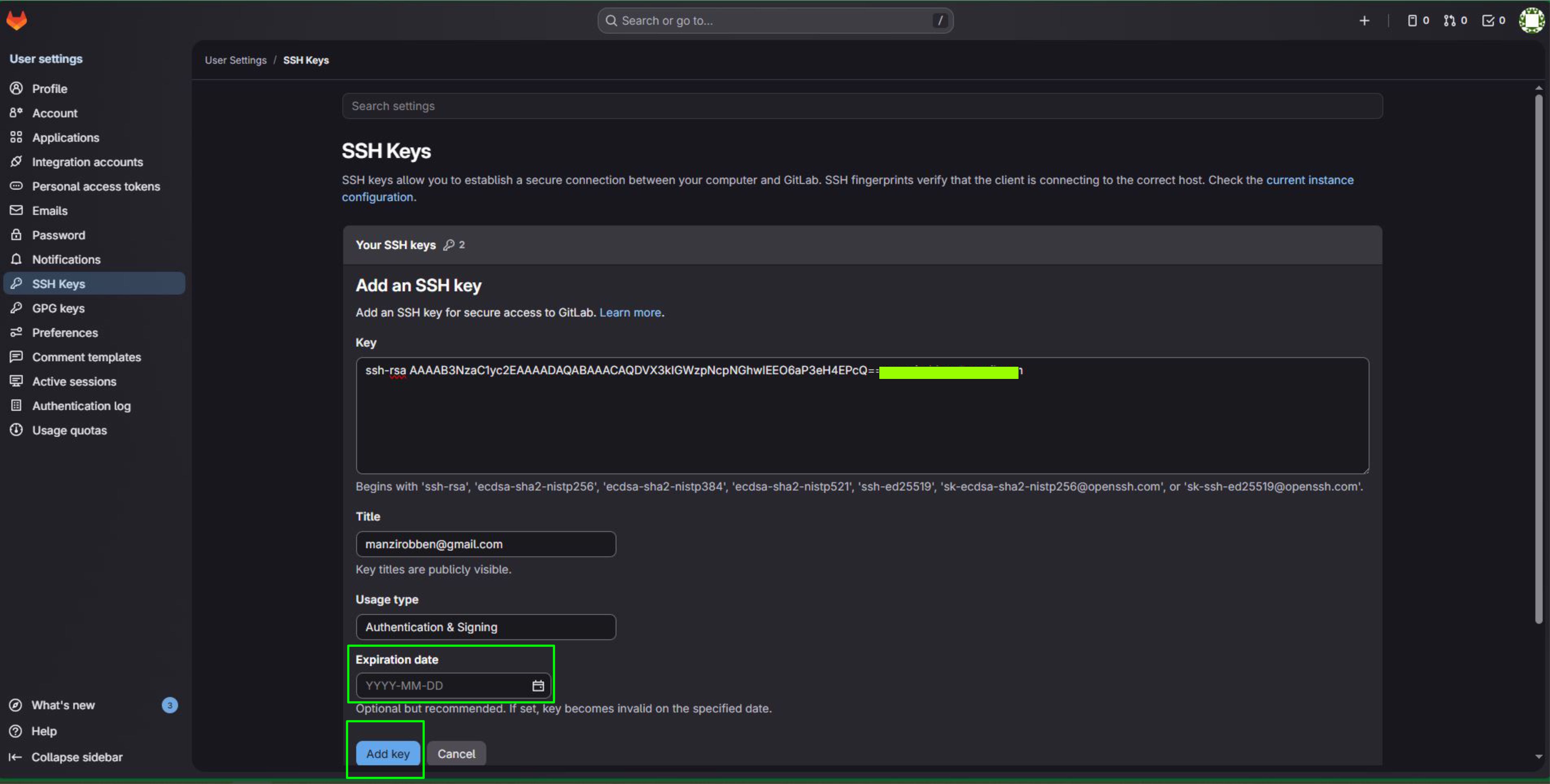 Next, I created an SSH key.