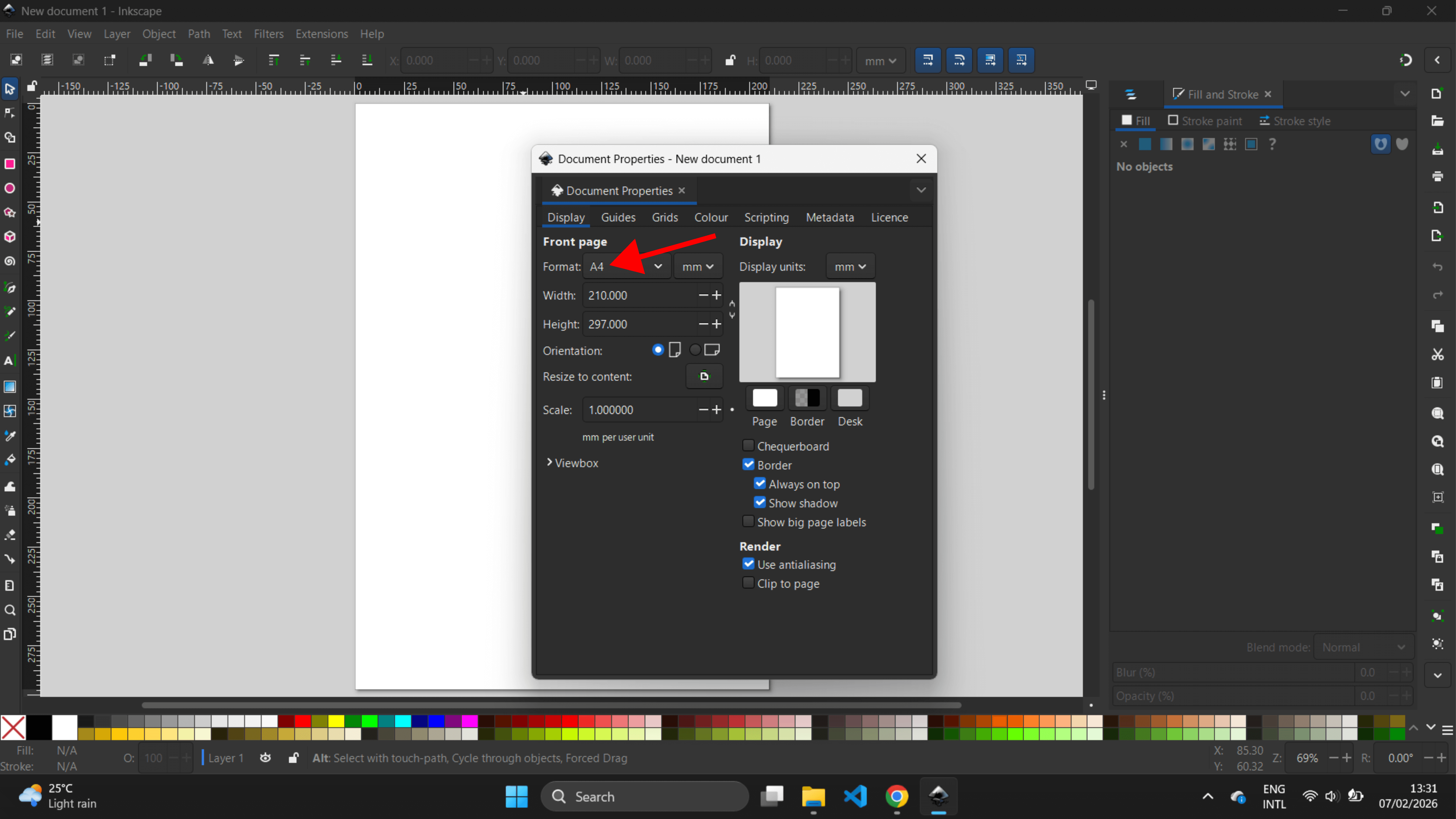 I used A4 paper (landscape) size 297*210mm. You can use custom size as well and click to creat from template