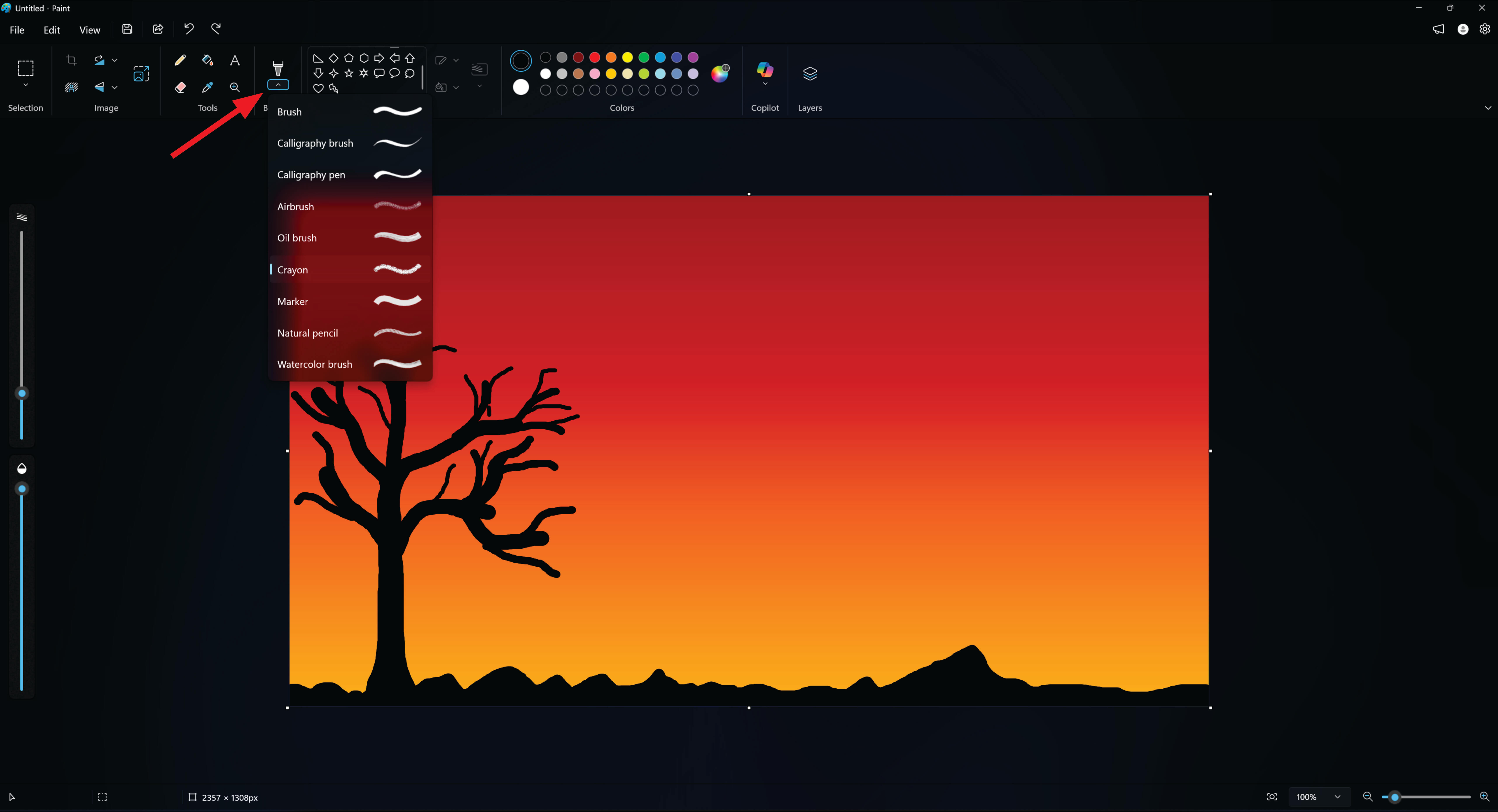 I used the crayon brush tool to draw the leaves on the tree with small strokes for detail.