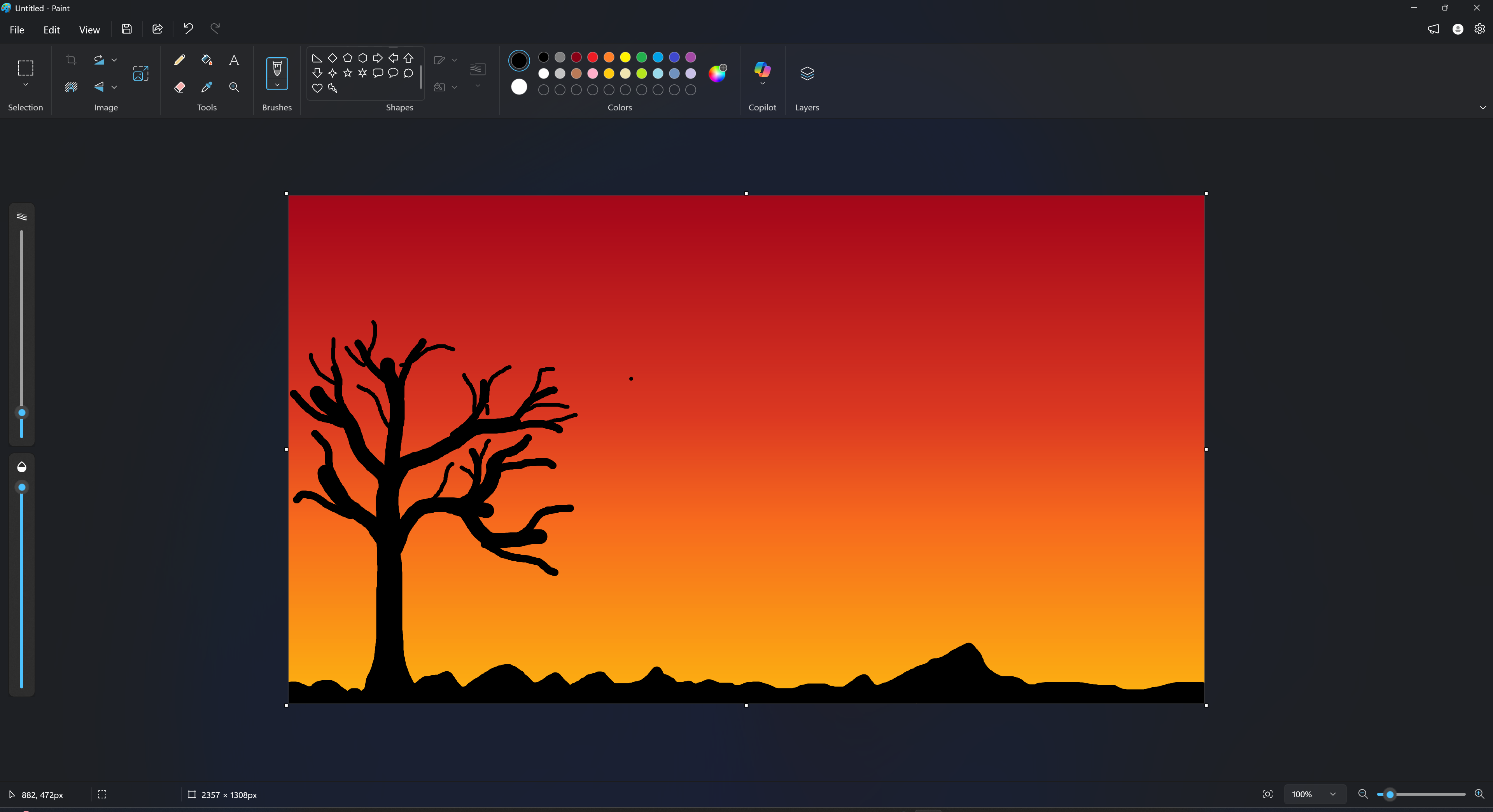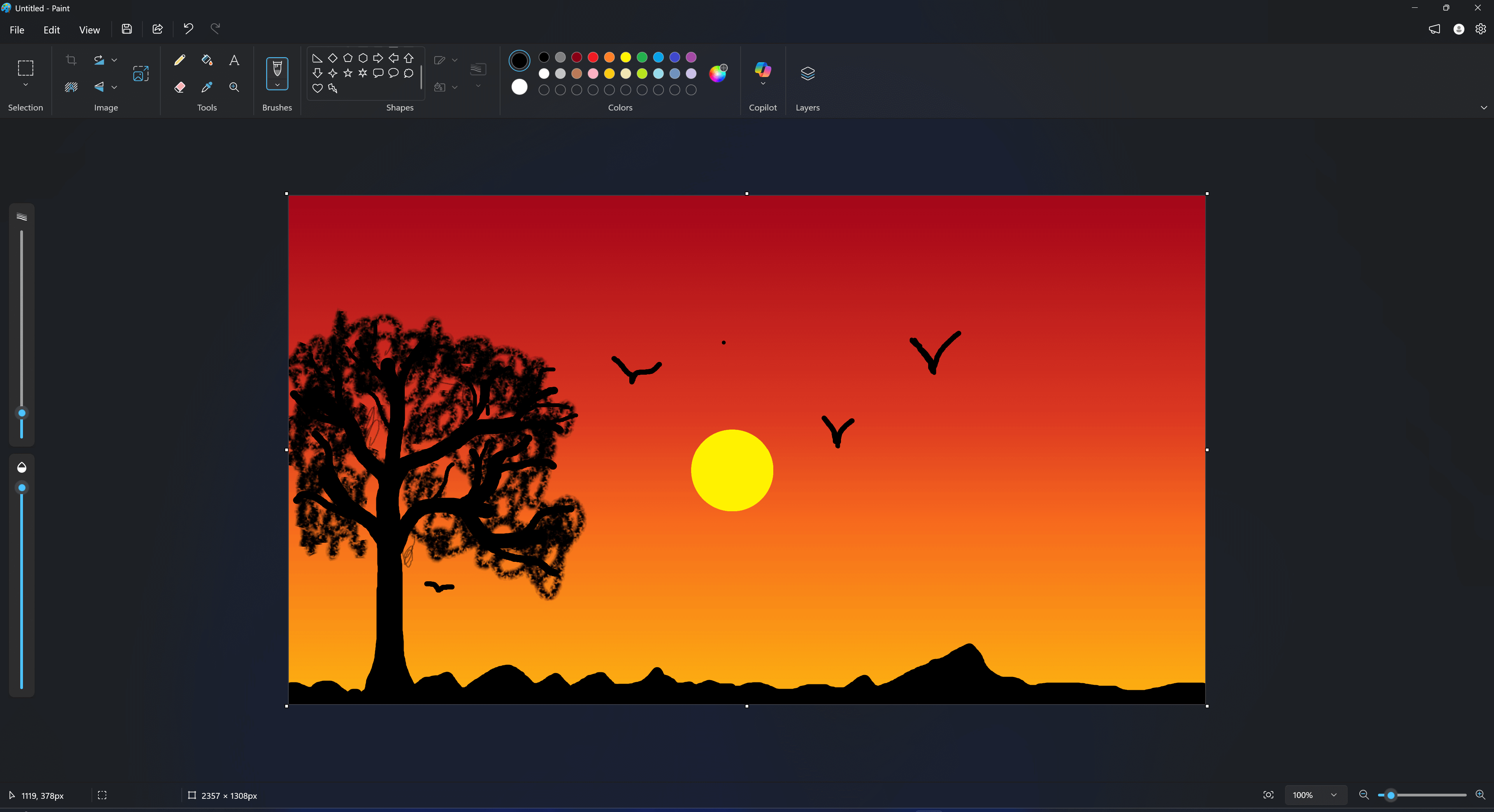 What I Learned:Through this exercise, I learned how to use Microsoft Paint tools such as fill, brush, pencil, shapes, resize, and skew. I also practiced creating a sunset background, sketching trees, leaves, and birds, adjusting brush sizes for detail, and enhancing the overall composition to make it look natural and dynamic.