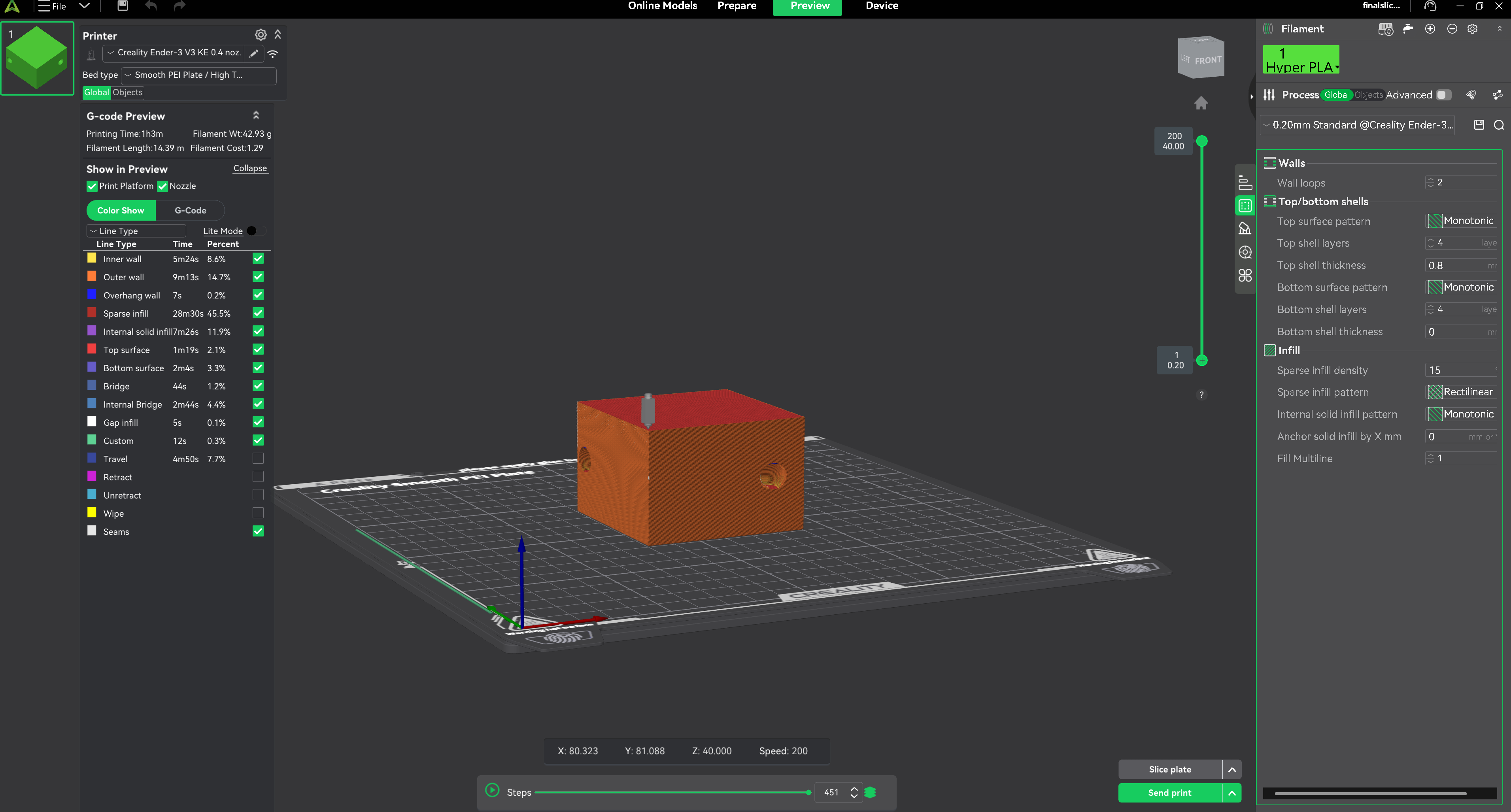 After setting the infill to 15%, I clicked the Slice in Creality Slicer to generate