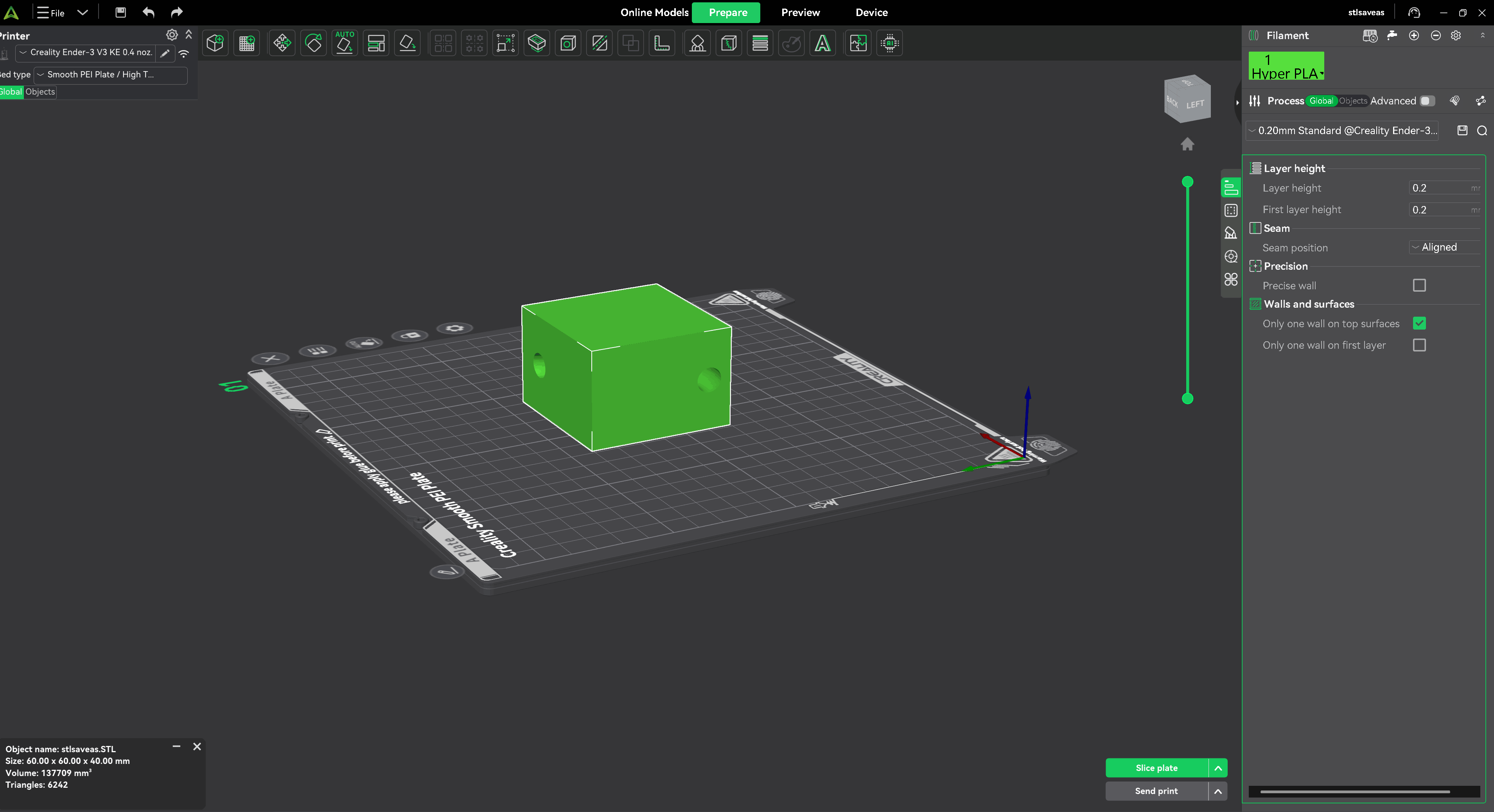 After saving the model as an STL file, I launched Creality Slicer and imported the design.