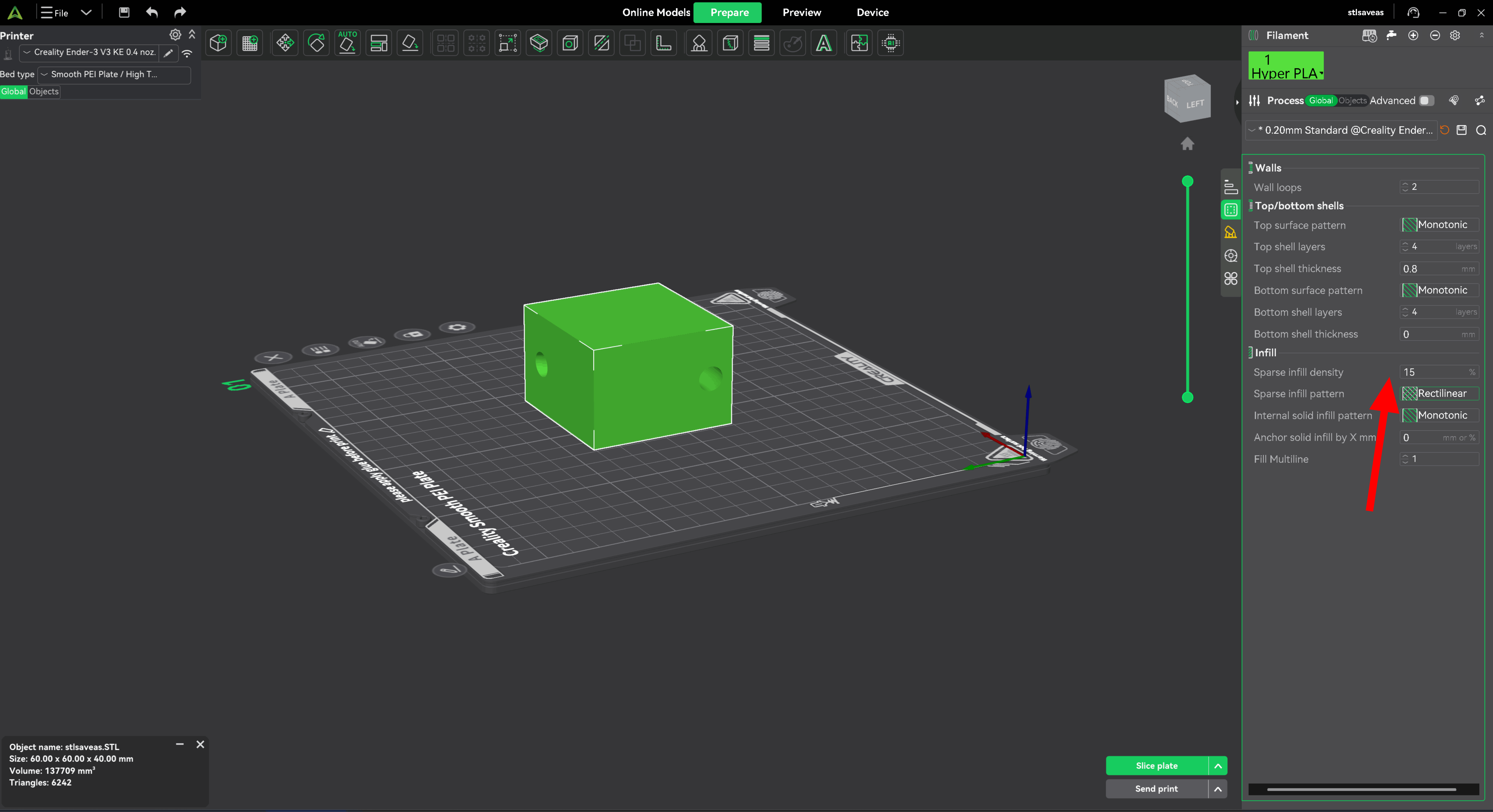 After setting the infill to 15%, I clicked the Slice in Creality Slicer to generate the toolpath and prepare the model for 3D printing